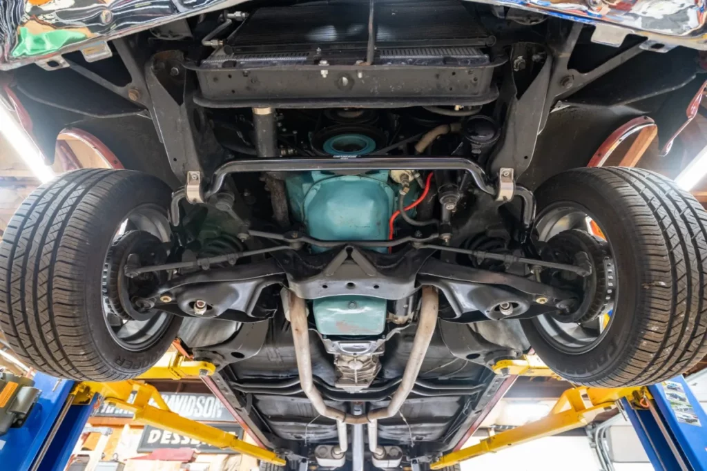The undercarriage is as clean as the top side. All the steering and suspension components look good. The floors are all clean original metal, no signs of any patches. There is a dual exhaust system that runs all the way out the rear with correct factory splitters. It has a newer gas tank, sending unit and straps. The E-brake system is all complete and working.