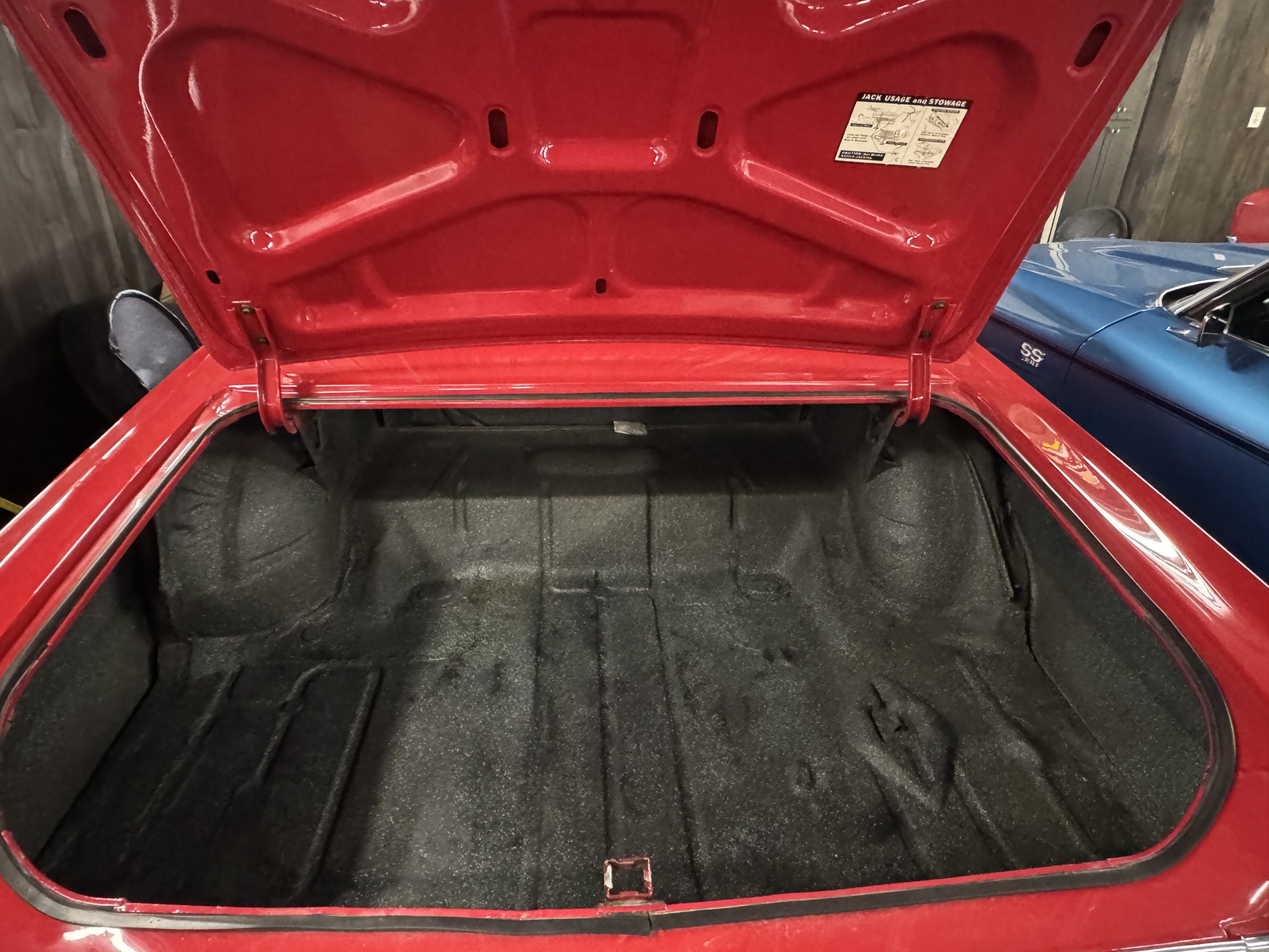 The trunk is solid and nicely detailed with factory spatter paint. It has a spare tire, jack assembly, lug wrench, trunk mat and newer weather stripping.