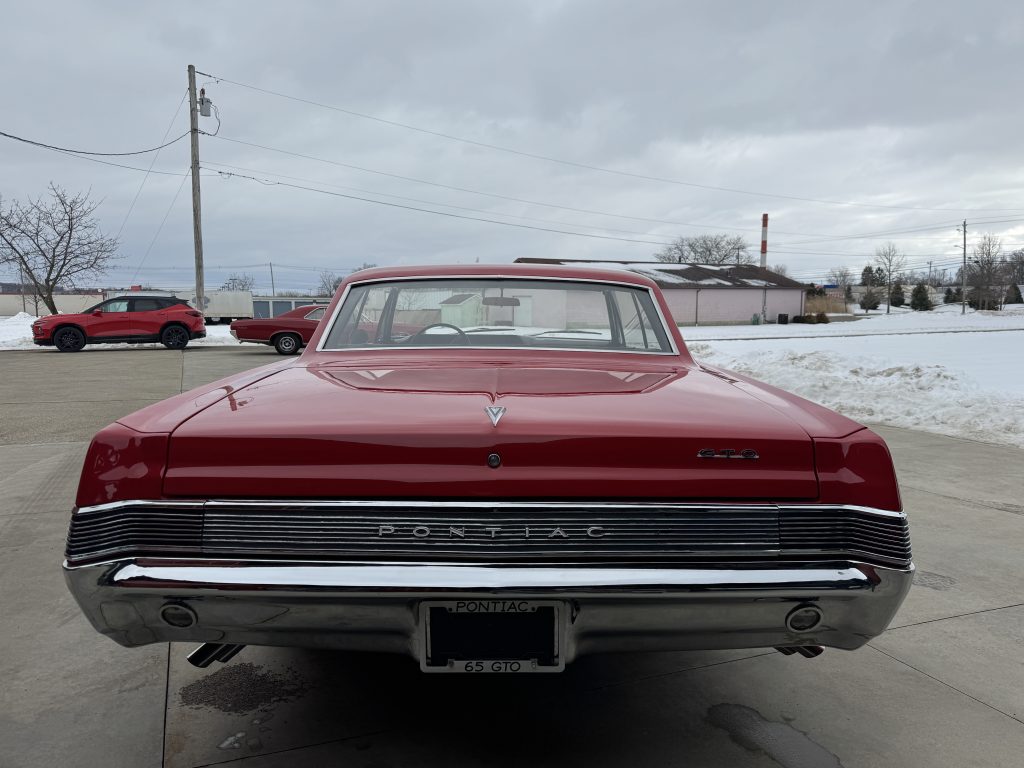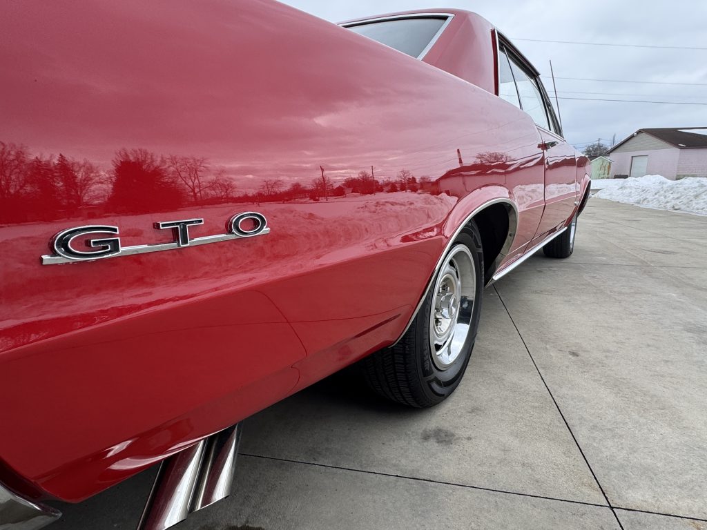 This is one good looking GTO in its factory color Montero Red, code R. It appears to have all the original sheet metal. It is straight down both sides, all the panels fit square and flush. The doors open and shut like new. The clear coat finish is smooth and glossy. The door jambs are just as glossy as the exterior. Up front; the bumper, headlight bezels and around the grills are in nice shape. The rear bumper has been rechromed. The tail panel and tail light bezels and lenses are in good shape. All the weather stripping has been replaced. The door handles and all the emblems are nice. It sits on a set of Rally 1 wheels with a set of newer Blackwall radial tires.