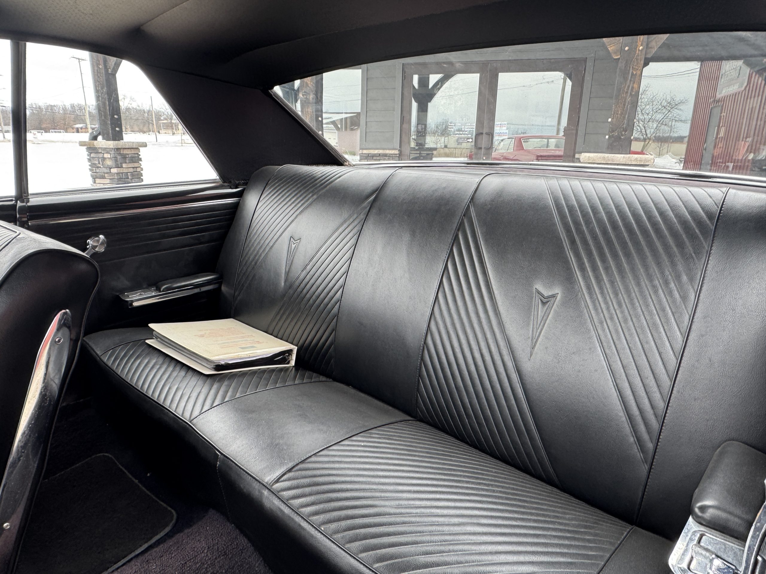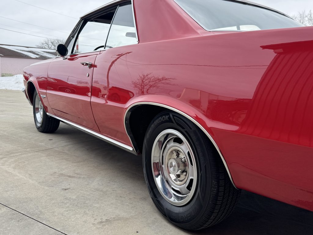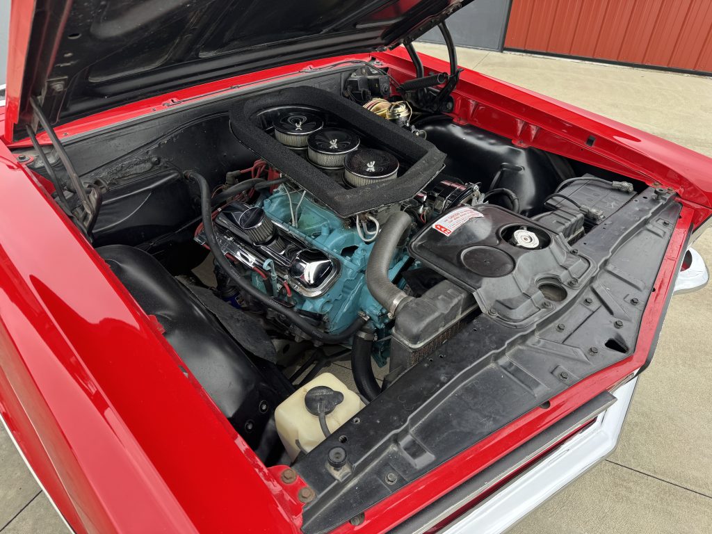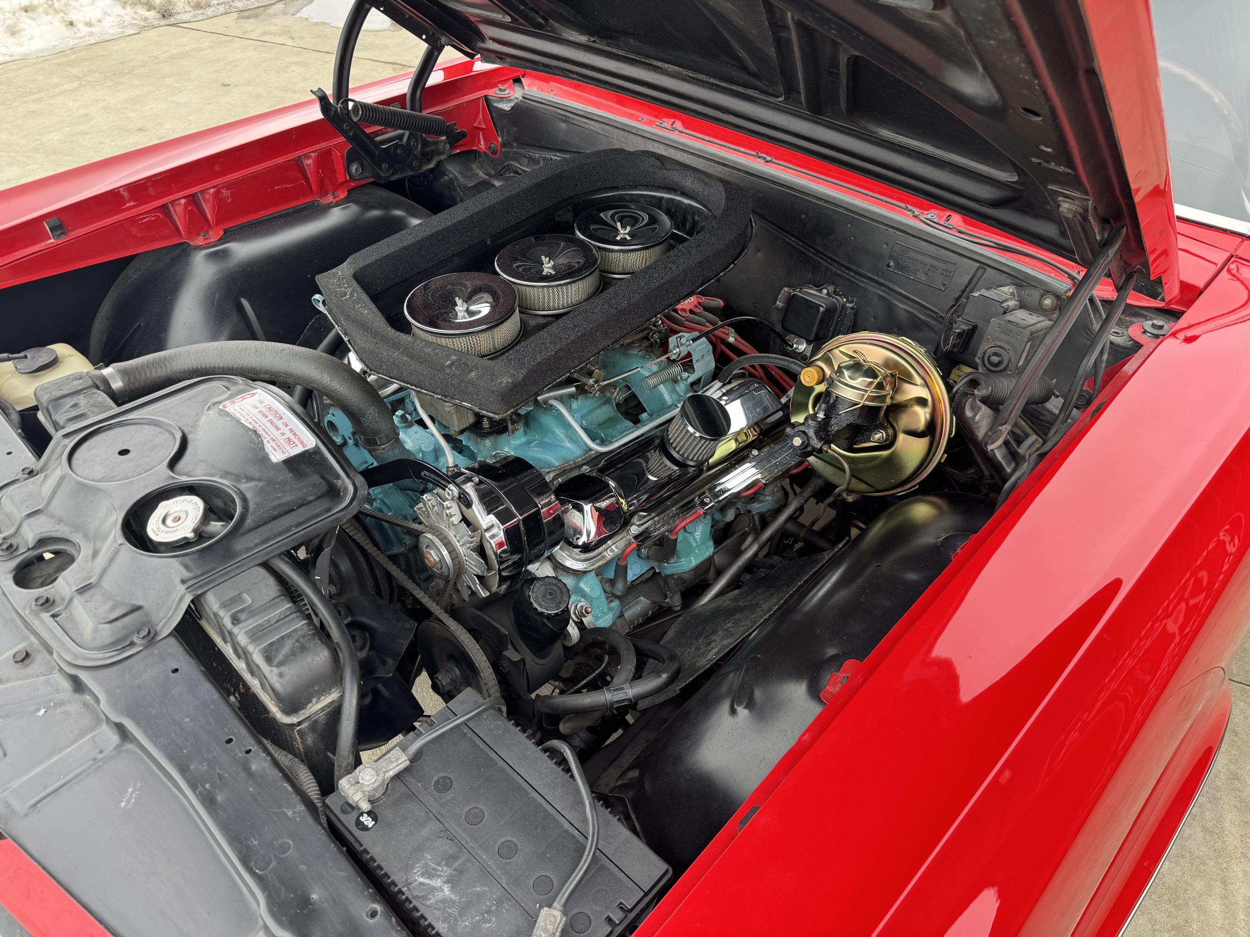 The engine compartment is nicely detailed with a date coded 1965 389 ci motor, casting number 9778789 that features a tri-power setup on it! The carbs have been completely restored and dialed in. It sports factory chrome valve covers. The brake booster and master cylinder have been replaced. The engine bay, core support and firewall are painted and have a nice satin black finish.