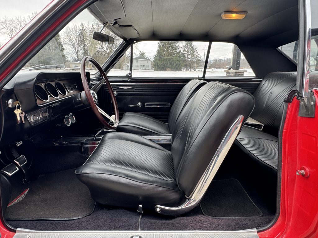 The interior looks good. The seat upholstery looks excellent. The door panels, carpet, headliner, armrest bases and pads have all been replaced. The rear seat is very nice. It sports an aftermarket three spoke wood steering wheel. In between the bucket seats there is a Hurst 4-speed shifter with white shift knob sticking out of the factory console. Looking at the dash it is in good shape and the lenses are clear. The heater controls slide with ease. It also features front and rear seat belts.