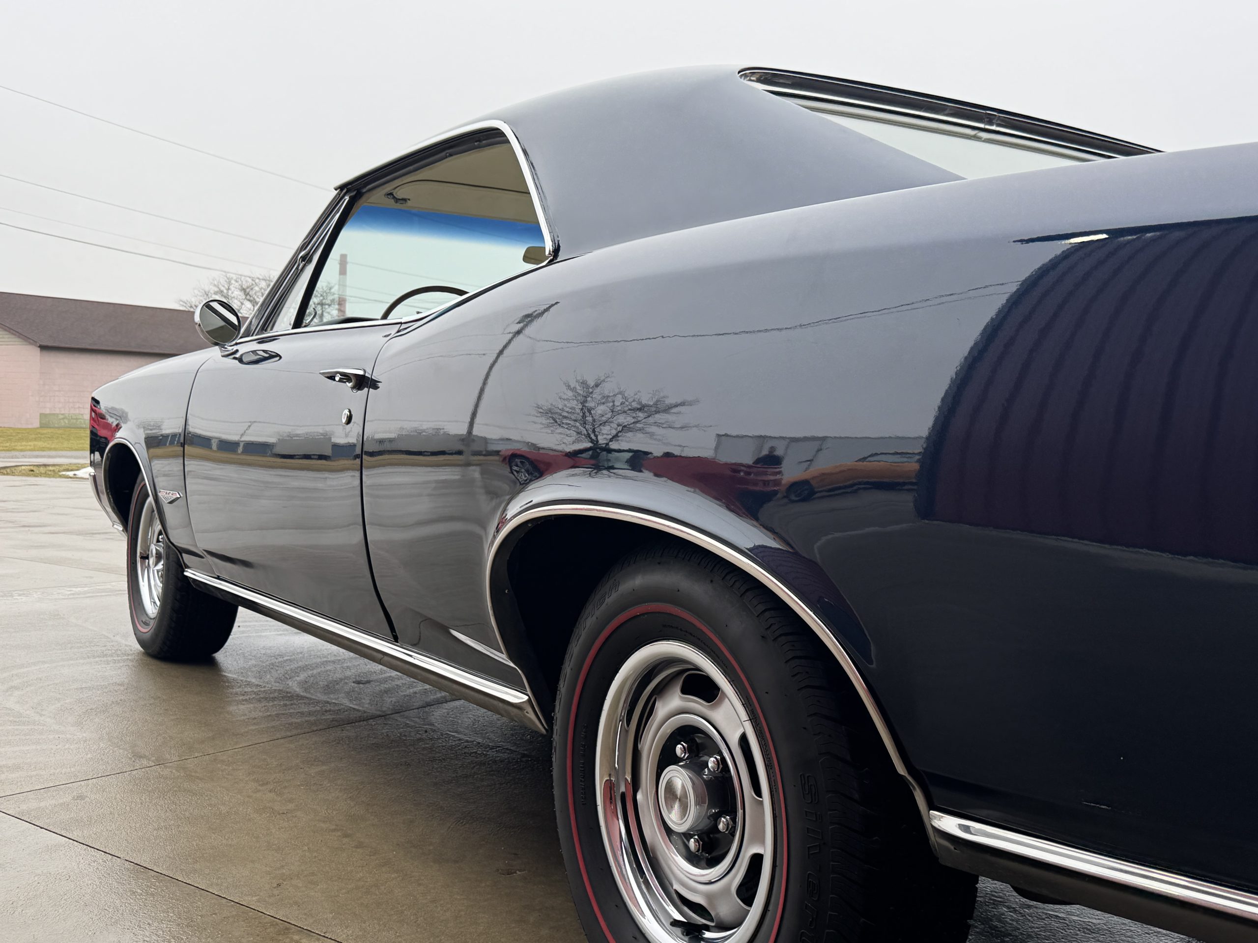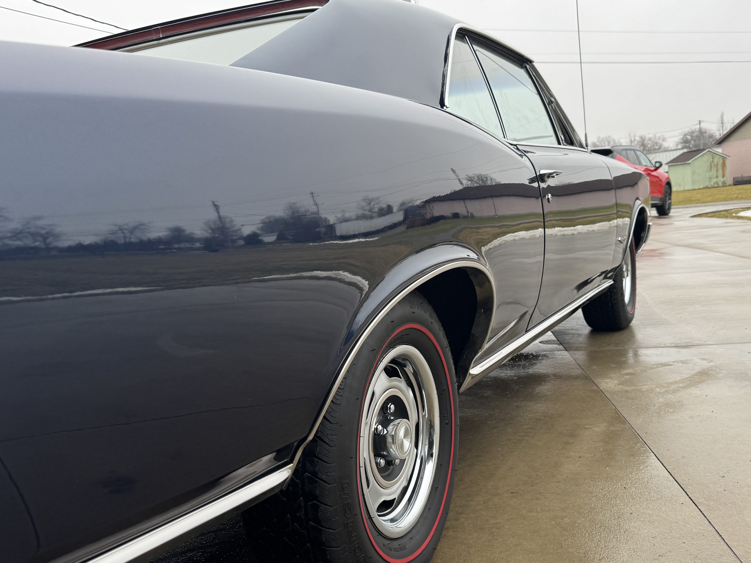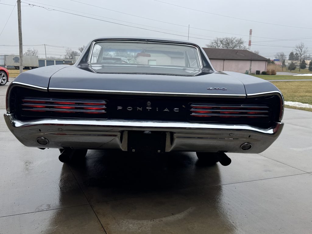 This is one clean 1966 GTO! Looking down both sides it is straight. It looks amazing in its factory color Nightwatch Blue, code E. The paint has a smooth and glossy finish. The front and rear bumpers have been rechromed. It sits on a set of Rally 1 wheels with BFG Silverton Redline radial tires.