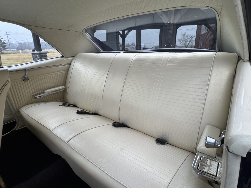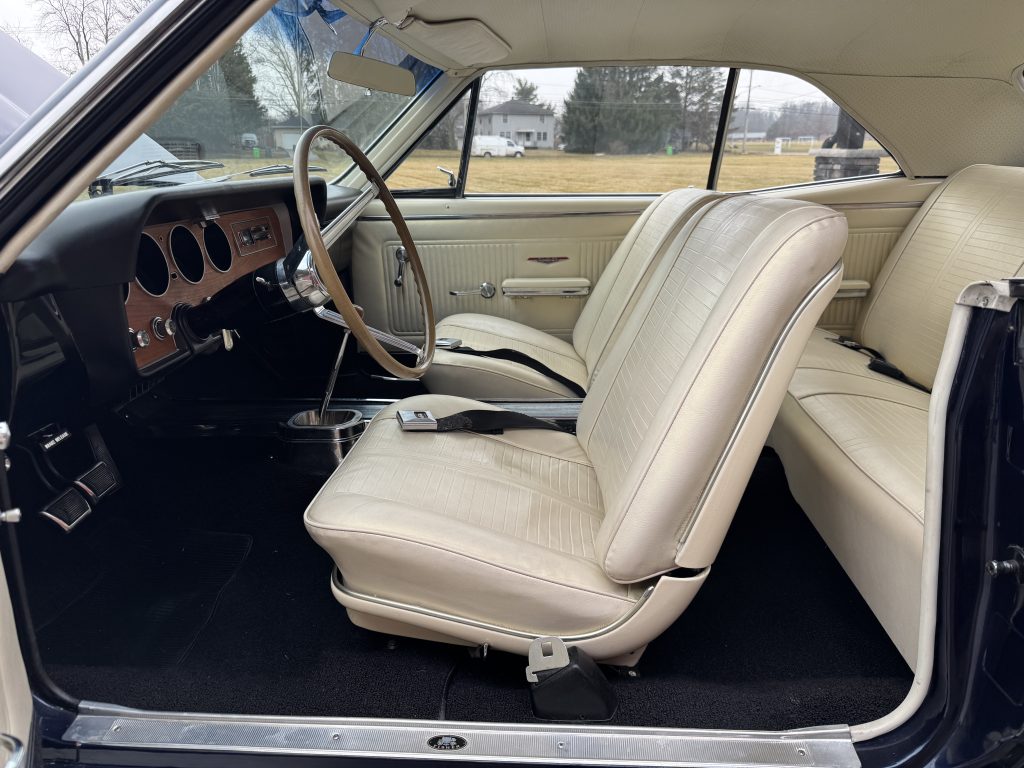 The white interior really pops up against the dark blue exterior. The interior is in great shape with new seat cushions and seat covers. In between the bucket seats is a factory 4 speed console with a factory Hurst 4-speed shifter coming up through it. The door handles, armrest bases, sill plates and kick panels appear to be original. Looking forward to the dash: It has a factory style tachometer in place of the clock. The dash pad is nice, no cracks. The carpet and headliner are nice. There is an AM/FM radio in the glove box.