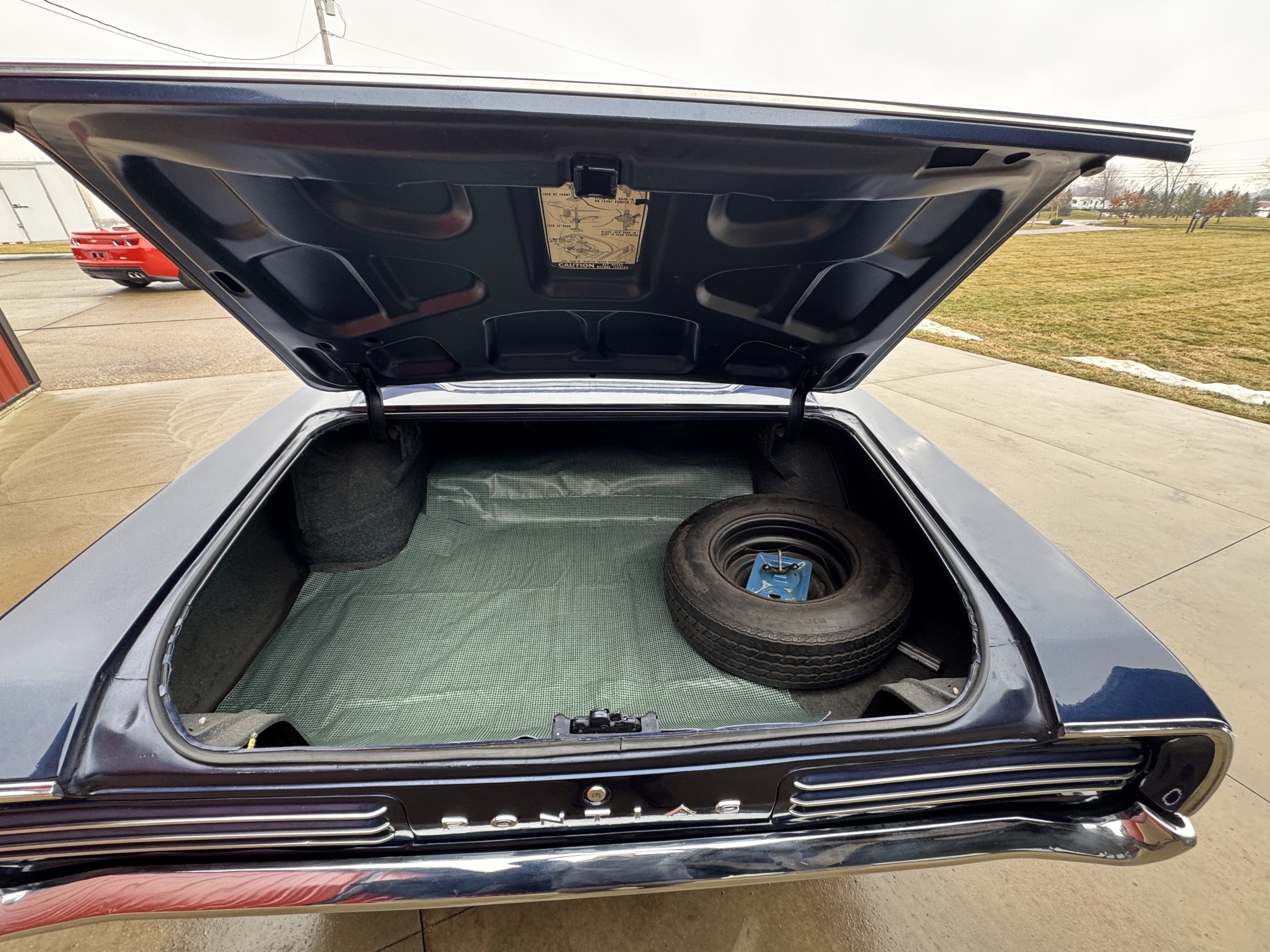 The trunk is all clean metal. It is complete with trunk mat and spare tire with jack assembly. It has a light coat of Black and Aqua spatter paint finish.