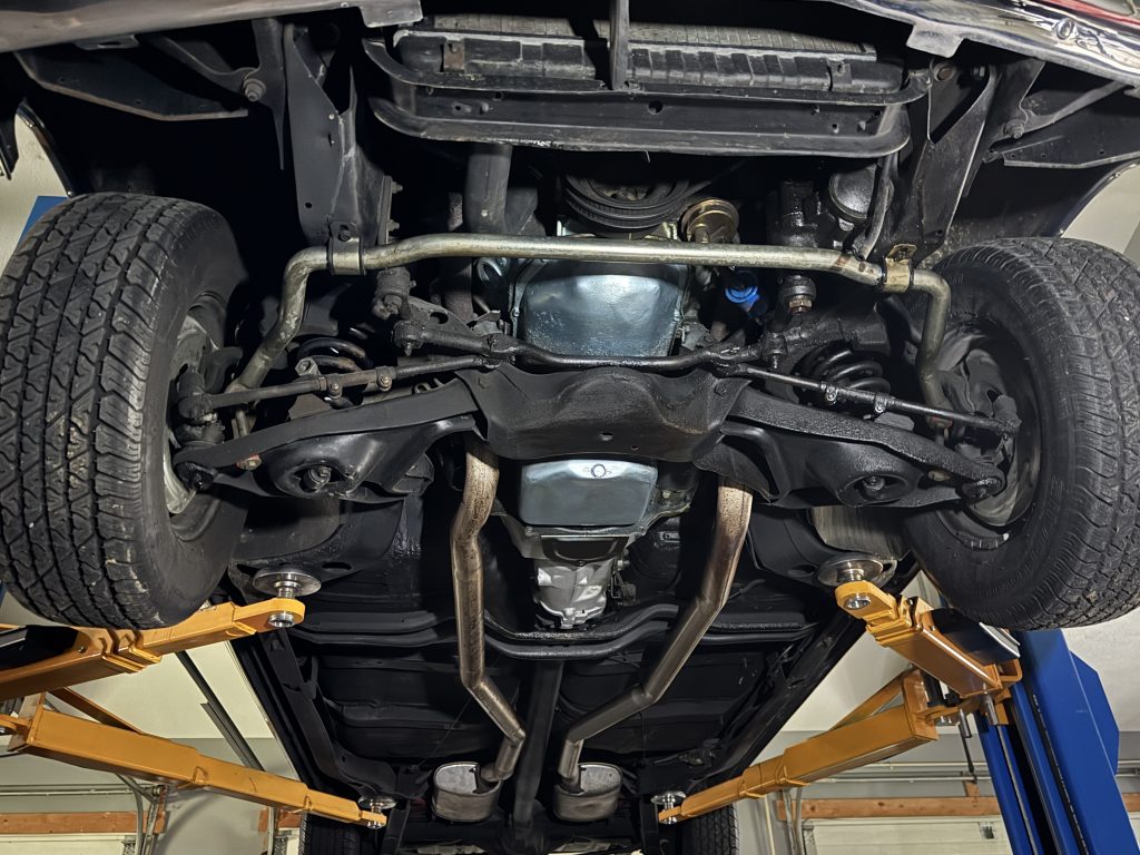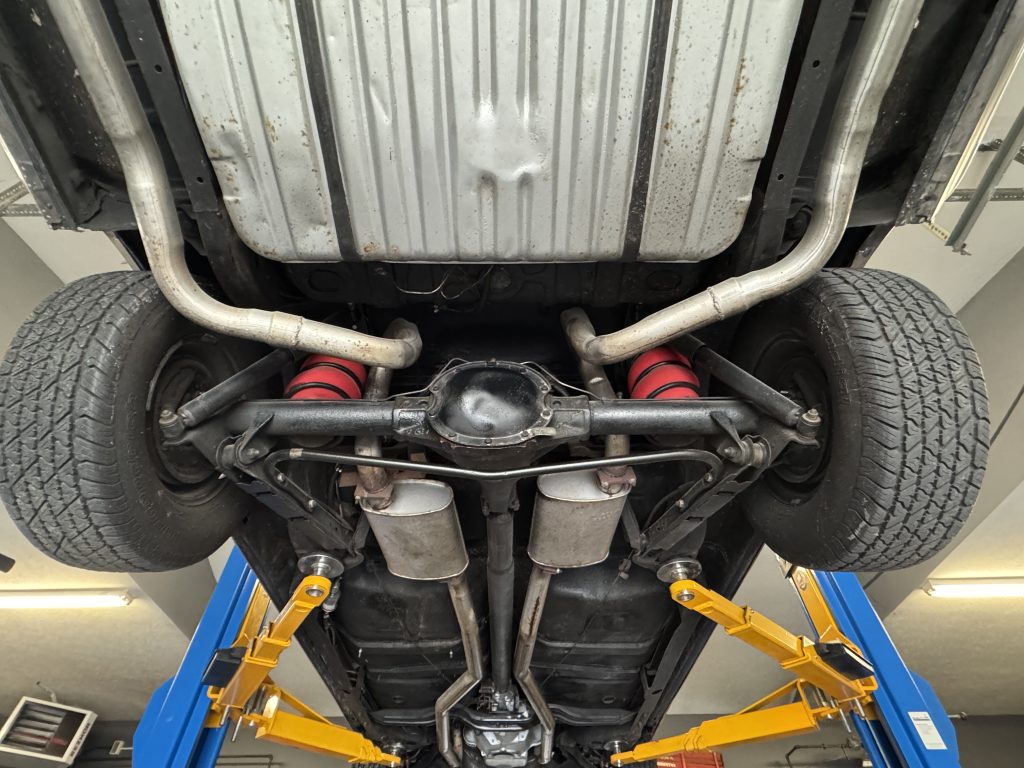 Looking up at the floors, it is all clean metal and appears to be original, no patch panels. The motor and Muncie 4 speed transmission look clean as well. It has a 2.5” dual exhaust with correct factory style mufflers and factory style tail pipes running out the back. The rear suspension has been upgraded with boxed in lower control arms and a rear sway bar. It has a Safe-T-Track rear end with 3:55 running gears. The E-brake assembly is complete and working.