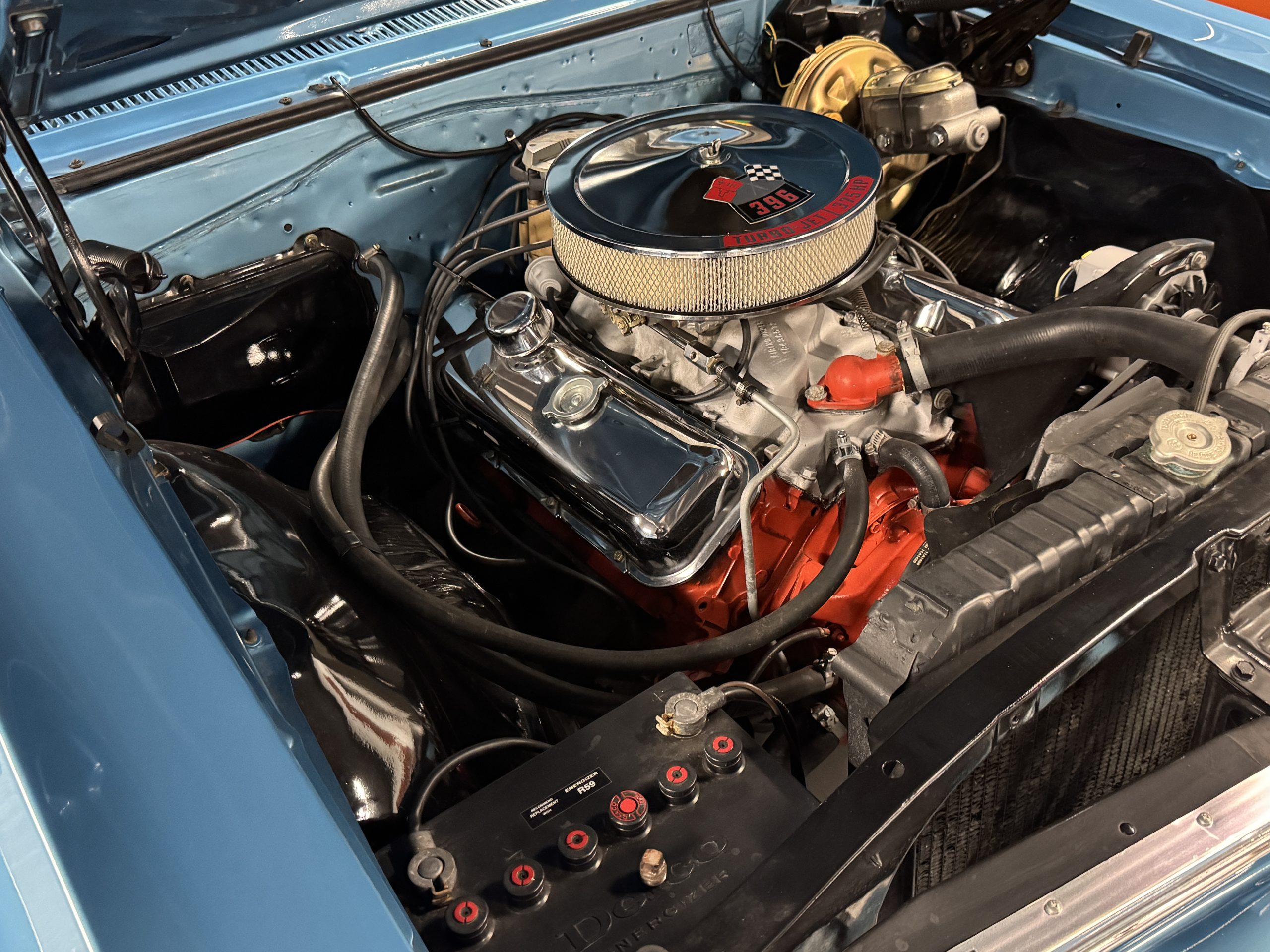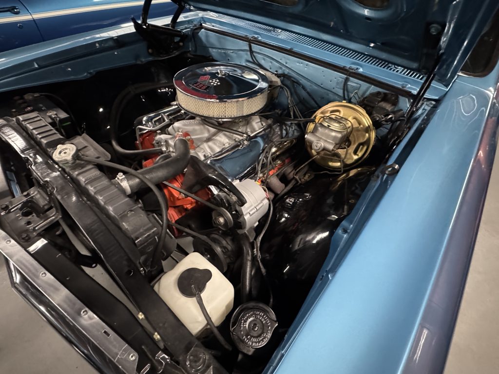 The engine compartment is nicely detailed. It has a period-correct 396 ci/ 375 hp engine with casting number 3955272 and a Winters aluminum intake manifold. It has been completely rebuilt! It has an original Harrison radiator complete with a finger guard, factory chrome valve covers, factory air cleaner, correct spring type battery cables, factory fan, alternator and all new wiring harness. It also has an upgraded HEI and factory power steering. The engine bay has a nice satin black finish.