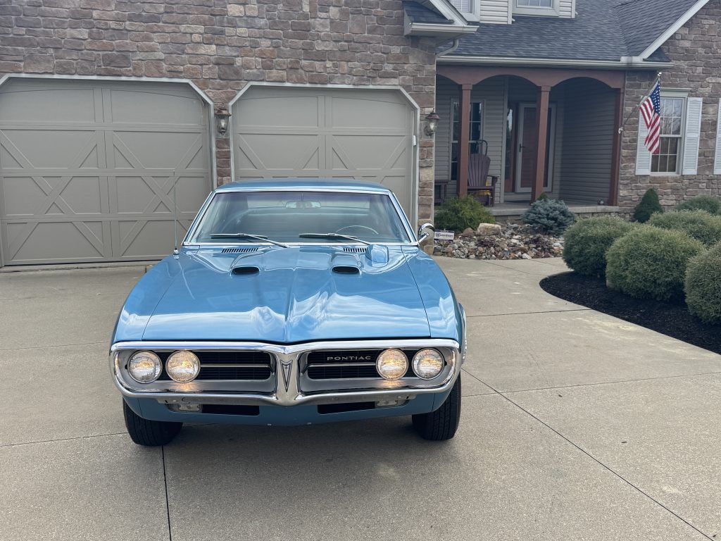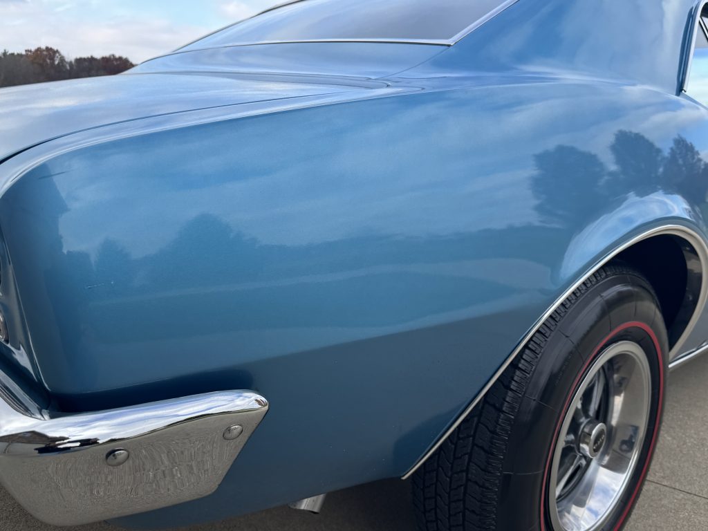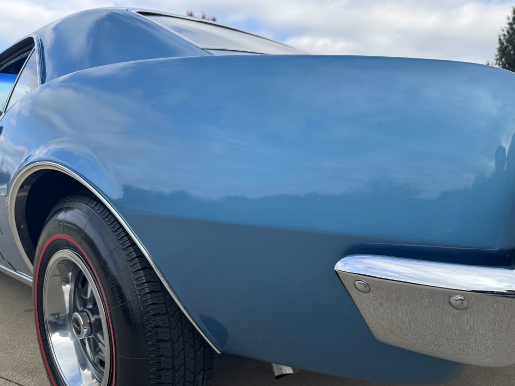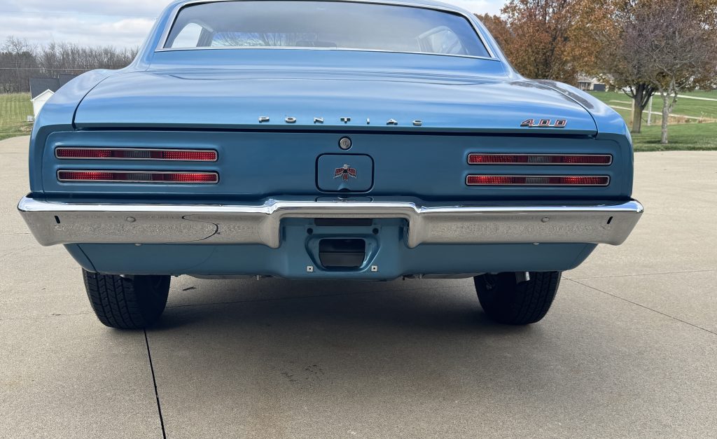 This beautiful restored rare Firebird 400 car wears its factory color, code FF Tyrol Blue. When looking down both sides, it is laser straight with excellent fitment. The front bumper, grills, door handles and emblems are all like new. The rear bumper, tail light lenses and emblems are like new too. It has all new window and door weather stripping and seals. It has a factory hood tach. It sits on a set of 14x7 Rally II wheels with like new trim rings, center caps and correct style lug nuts surrounded by 215/75/14 Coker Classic Redline radial tires.