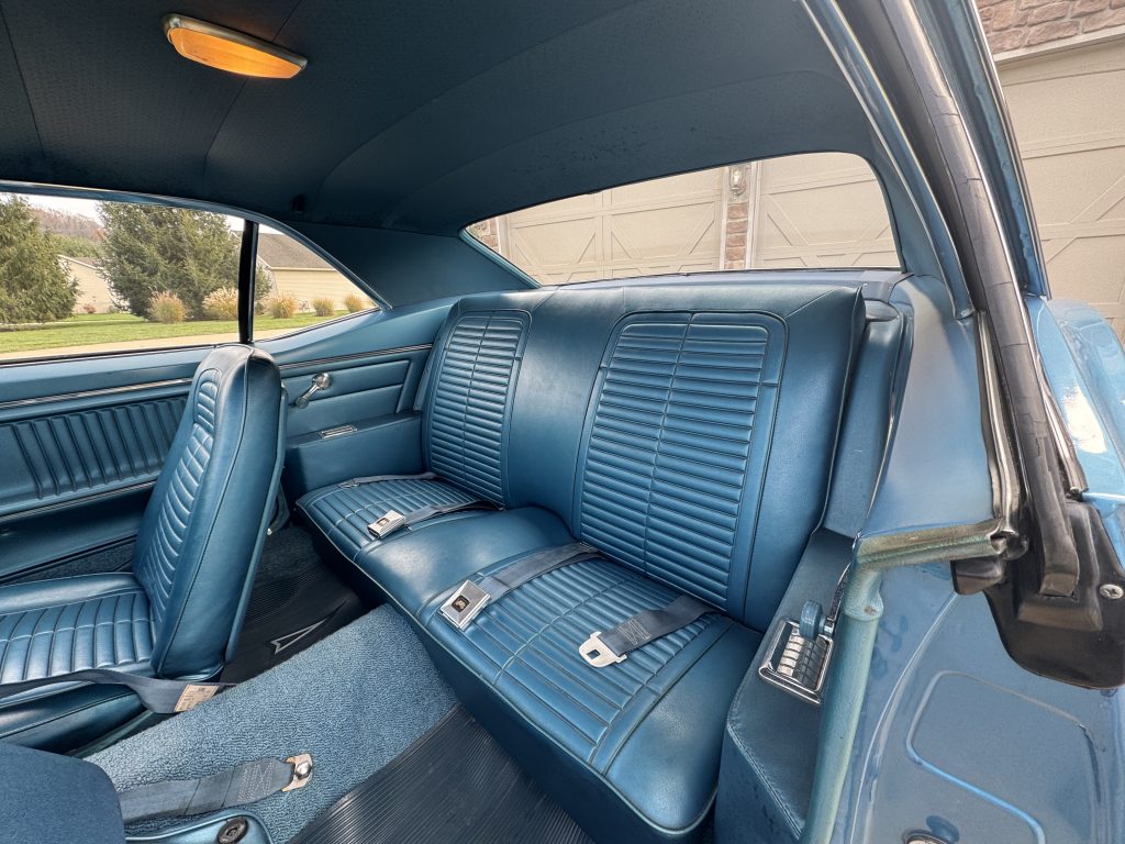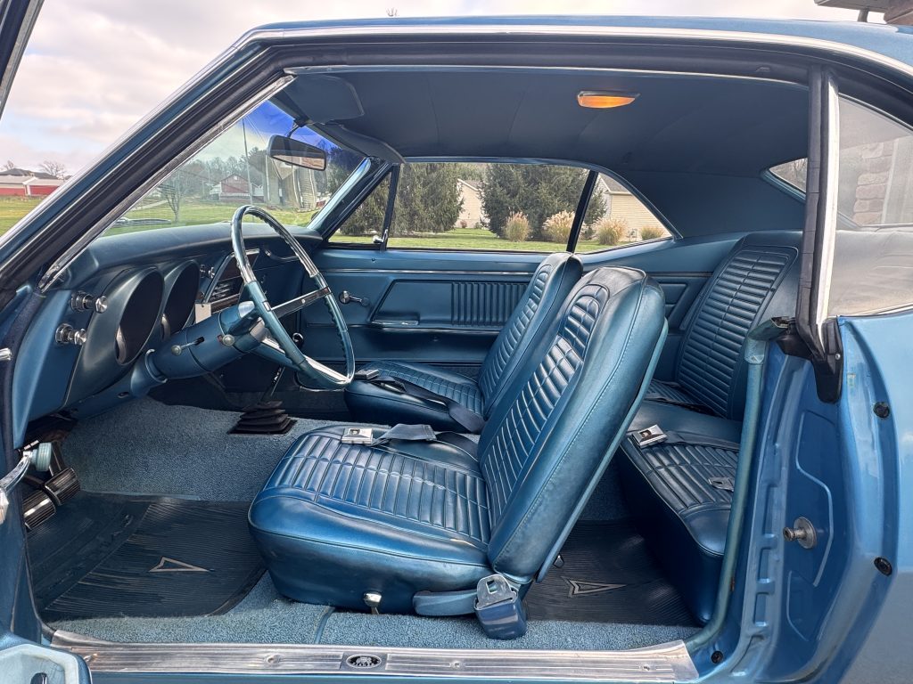 The blue deluxe interior appears to be original, it's in great shape from the carpet to the headliner. Looking at the dash: the optional factory Rally gauges function like they should, the lenses are clear and the dash pad is nice (no cracks), the heater controls slide with ease. It also features a working factory AM/FM radio. This Firebird sports its factory 3-spoke steering wheel on a tilt steering column, has remote mirror door, edge moldings, factory Pontiac front and rear floor mats, front and rear deluxe seat belts.