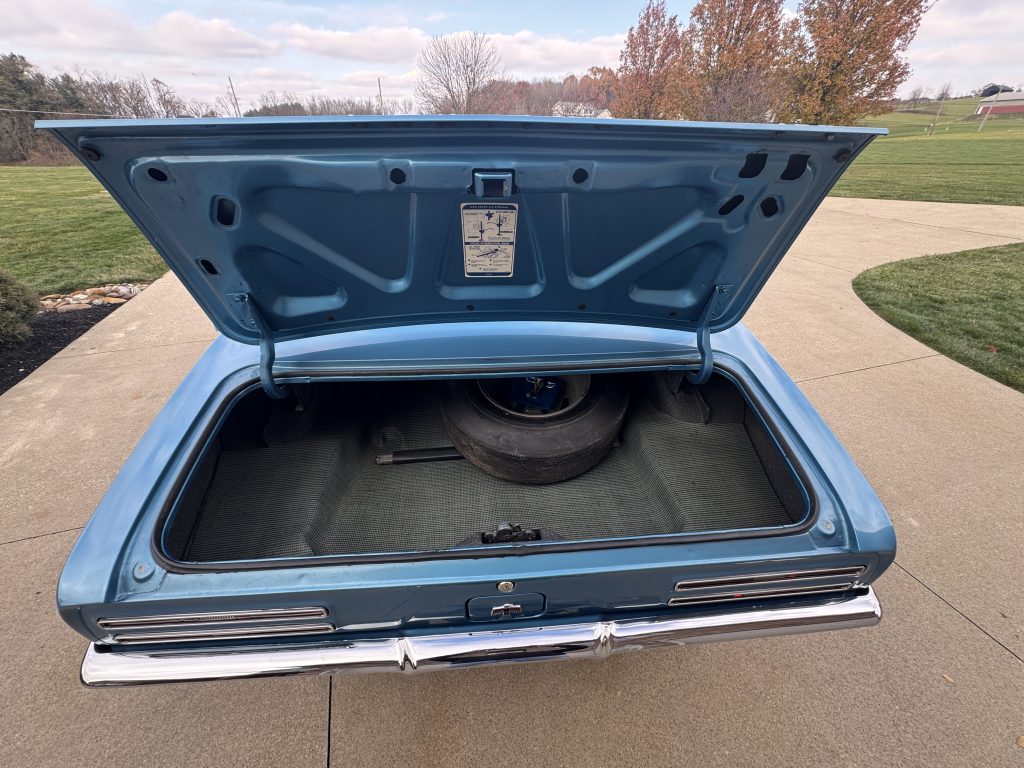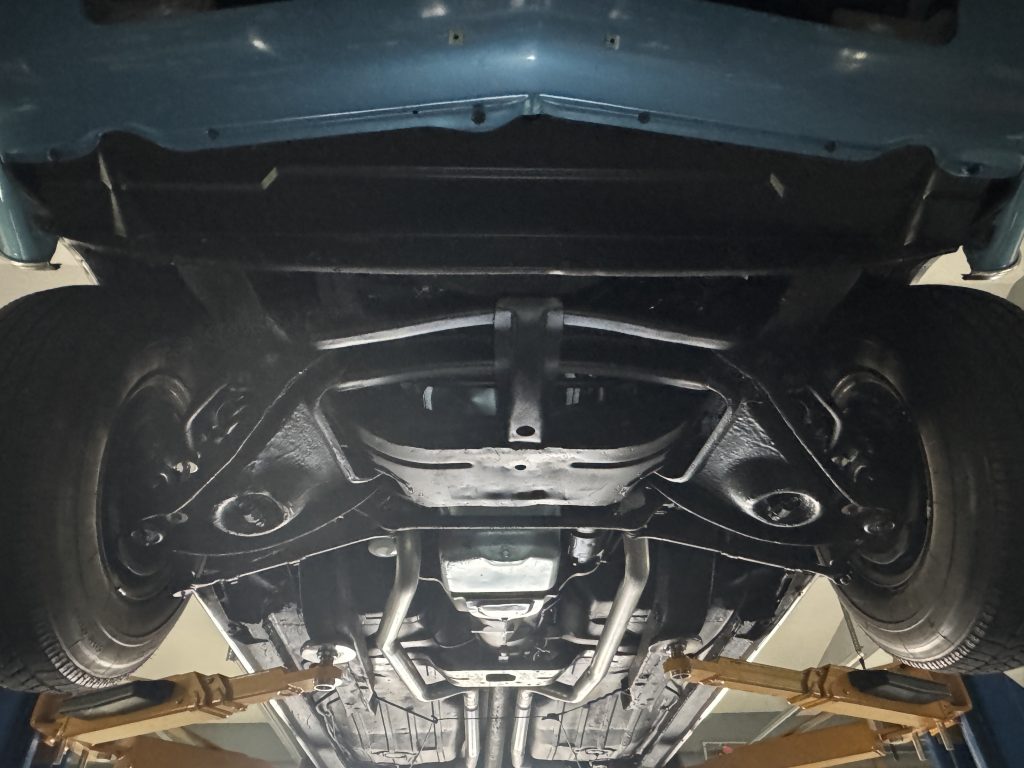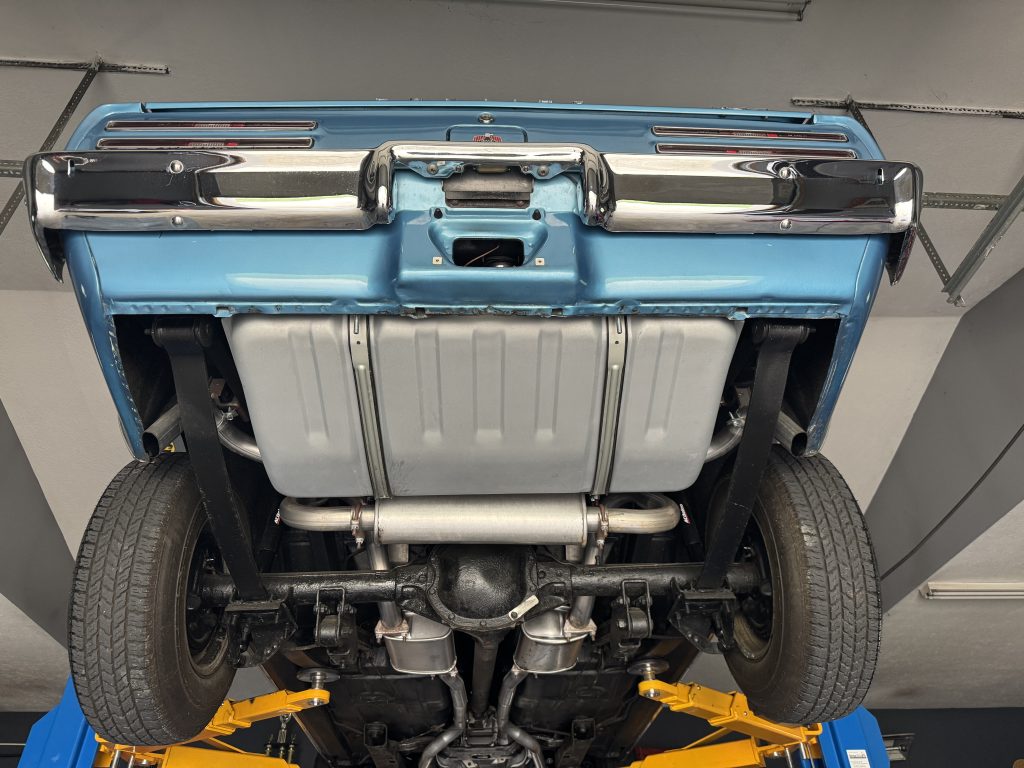 The undercarriage is all clean and original metal. It has a M20 Muncie 4 speed manual transmission, new front suspension and bushings, brake lines and fuel lines look good. It has a newer fuel tank and straps. It sports a 10 bolt 3:55 Safe-T-Track rear end with factory dual traction bars. The bottom of the motor and transmission are clean. The E-brake assembly is complete and working. There is a newer dual exhaust system with Turbo mufflers.