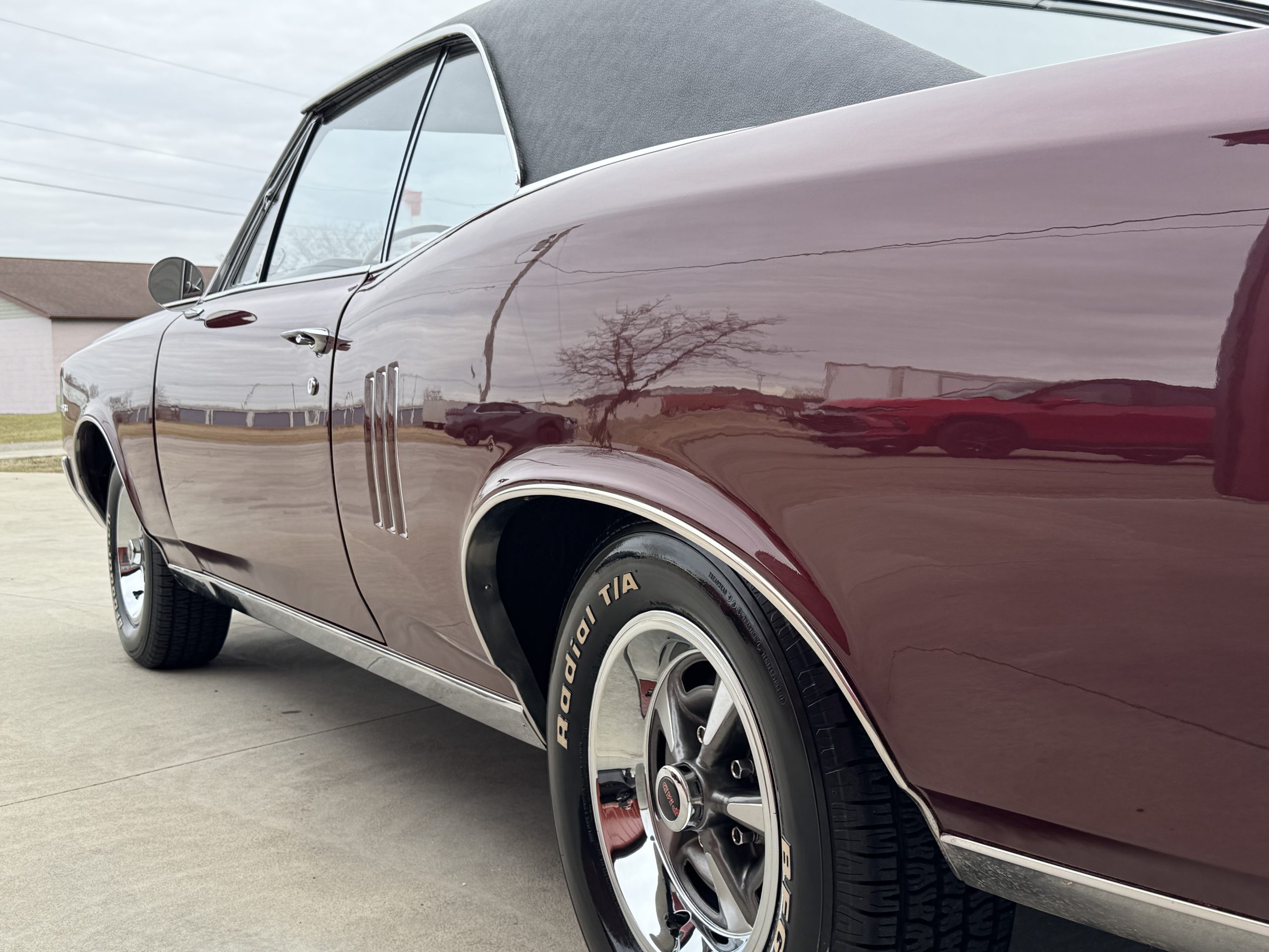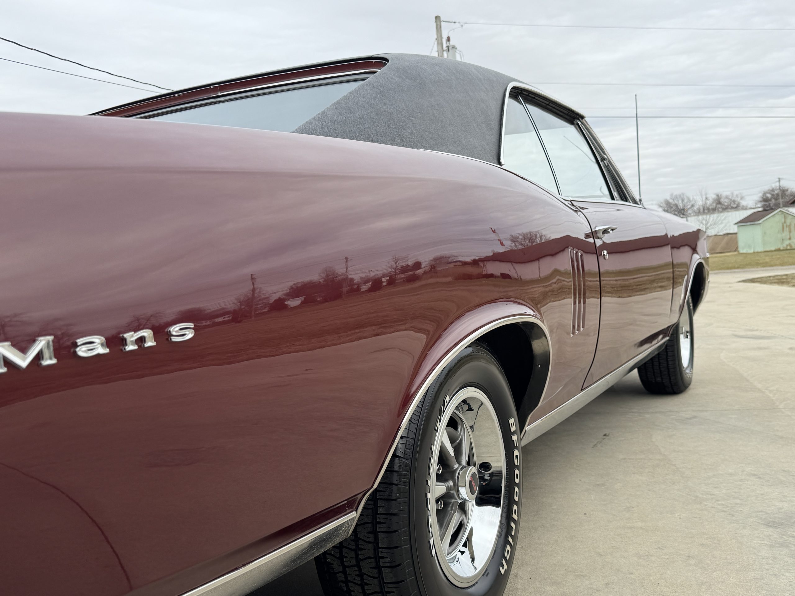 This is one nice LeMans! It appears to have all original metal. This LeMans has great fit and finish in its original color Burgundy code N. The paint is smooth, glossy and polished out beautifully. Looking down both sides it is straight. The vinyl top is in great shape as well. Up front the front bumper and headlight bezels are in great shape. The grills look great along with the parking lights. All the stainless trim is in great shape, nice chrome on vent windows, mirrors and door handles. The rear bumper is nice and shiny. The emblems and trim are in great shape. The windows line up good. It sits on a set of Rally II wheels with correct black PMD center caps, new trim rings with newer 225/70/14 BFG T/A radials!