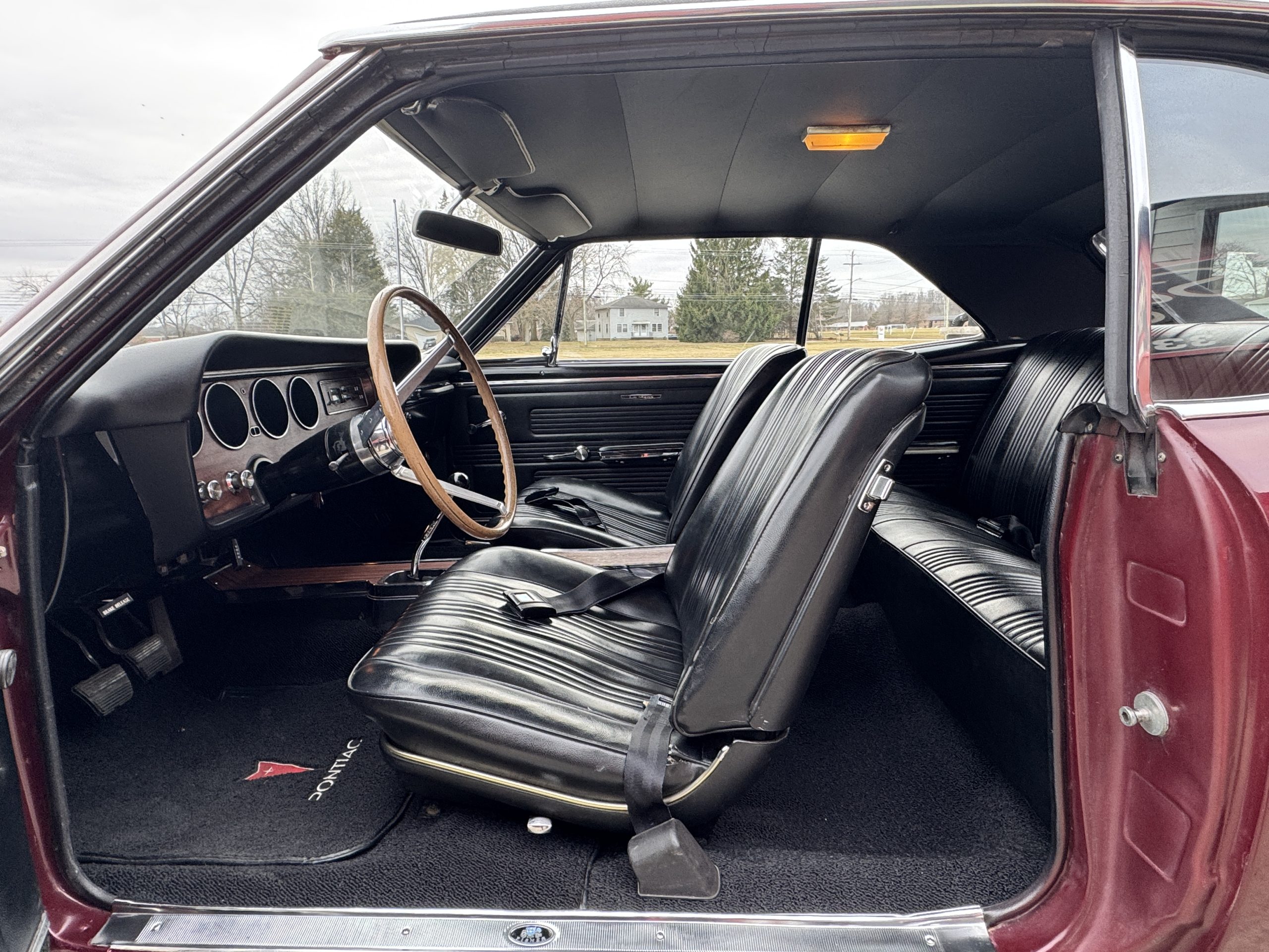 The factory black bucket seat interior is in great condition from the carpet to the headliner. It features a factory 4-speed shifter, Pontiac 3-spoke wood steering wheel and working factory AM radio.