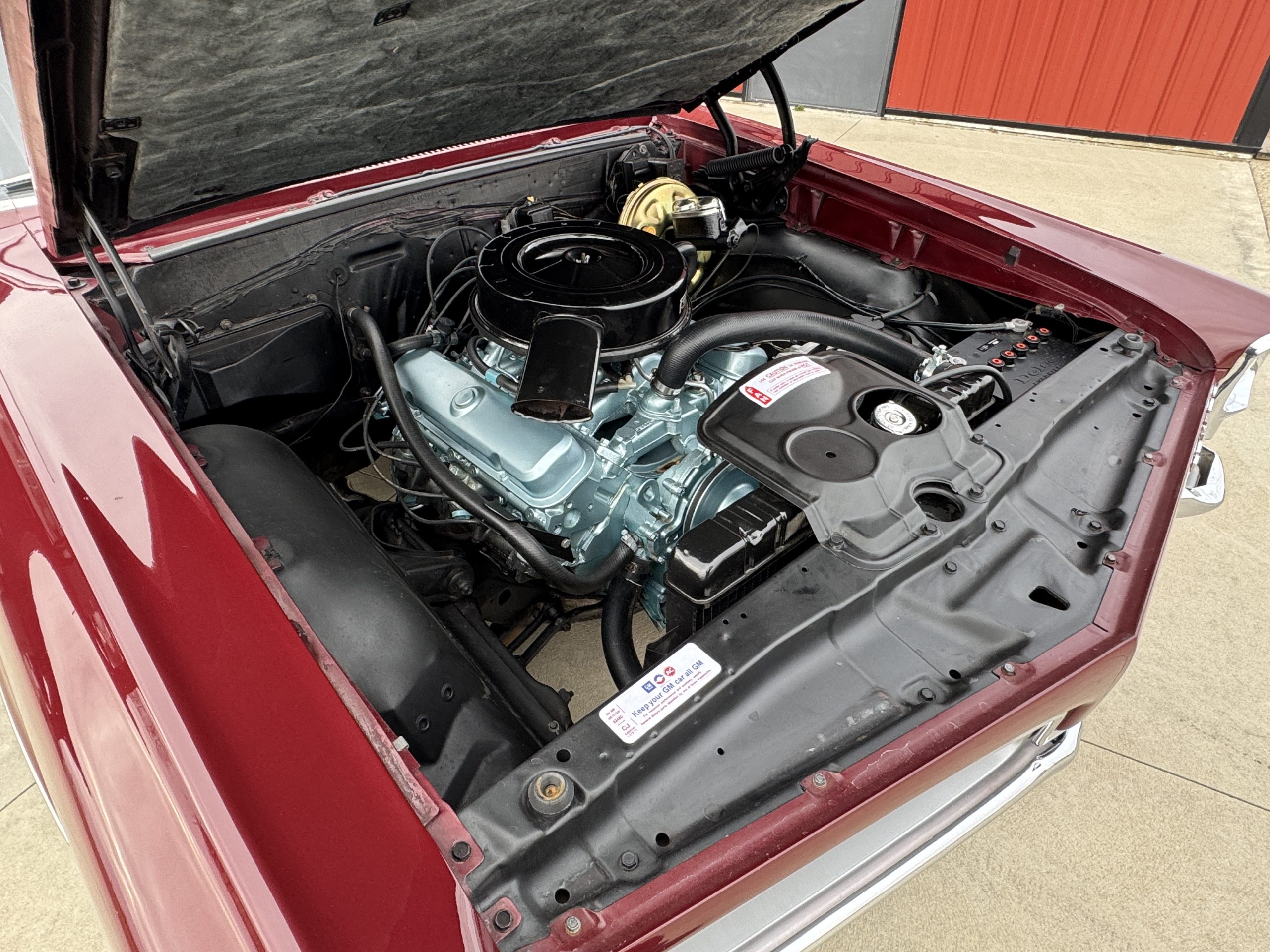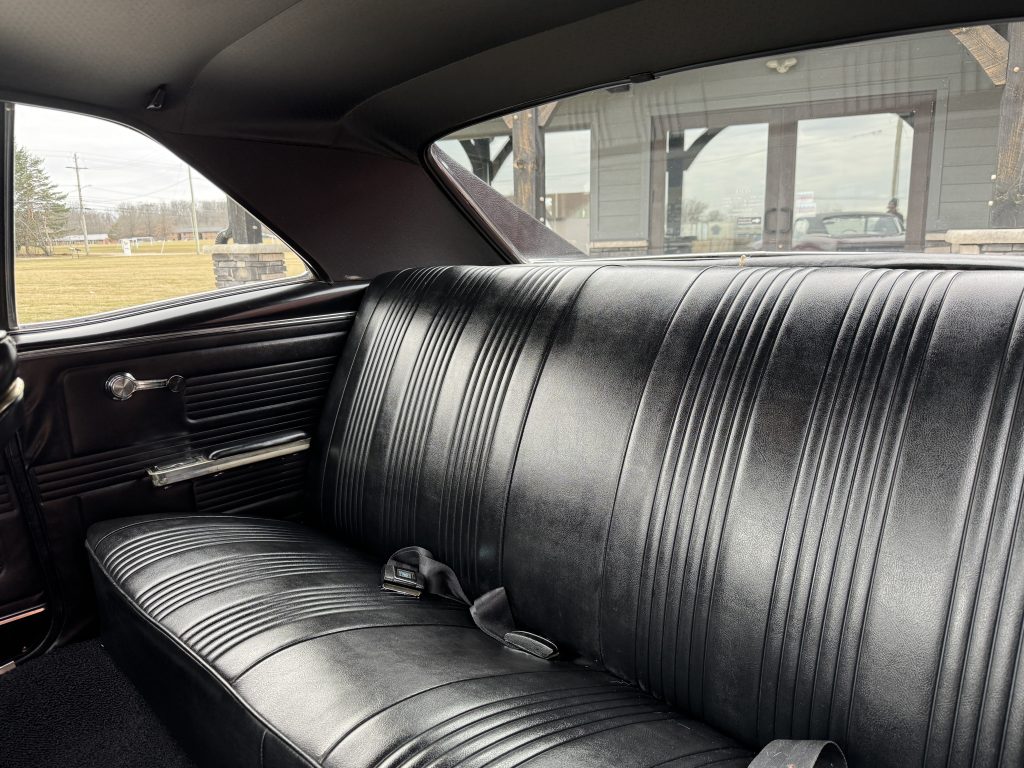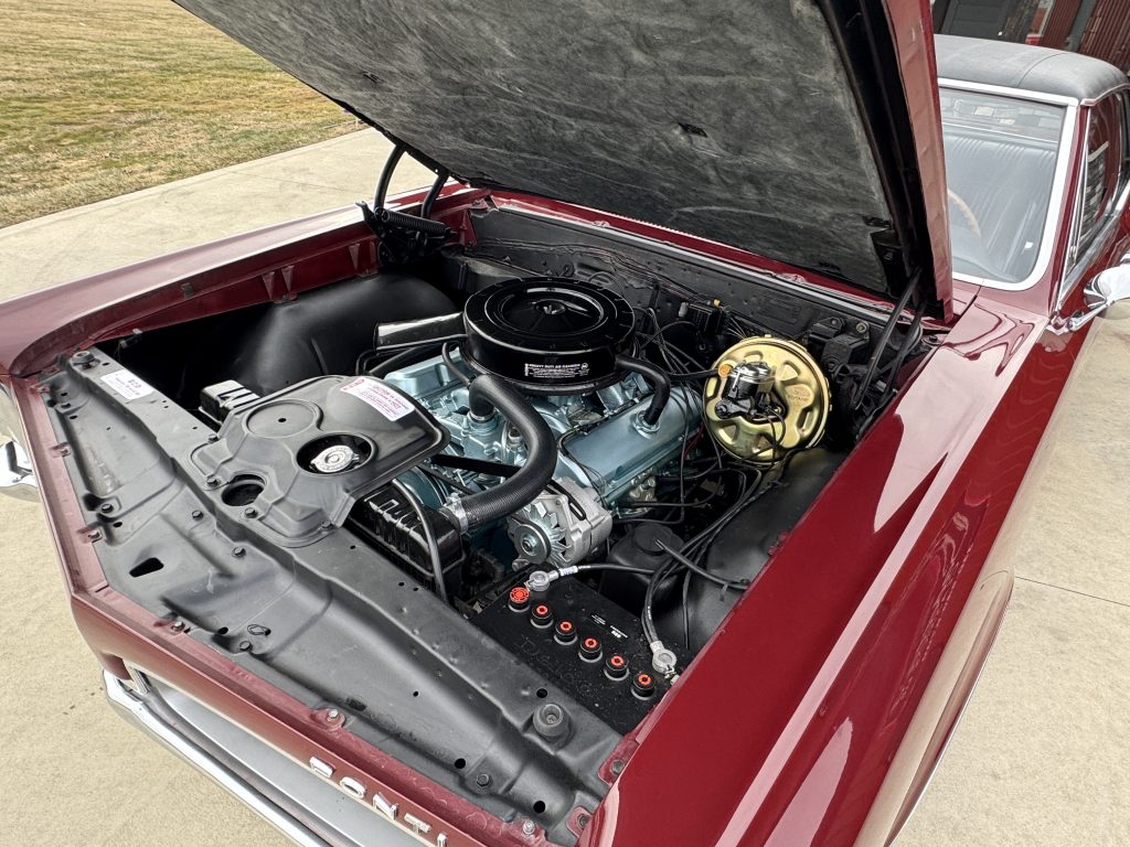 The engine compartment is nicely detailed, it has a completely rebuilt 1967, 326 ci engine. It also has factory manifolds, a Harrison 4-core radiator with factory fan shroud, and a new cadmium plated brake booster with new dual master cylinder. It is nicely finished in satin black. It features the correct air cleaner, carburetor, correct spring type battery cables and battery topper for the original look.