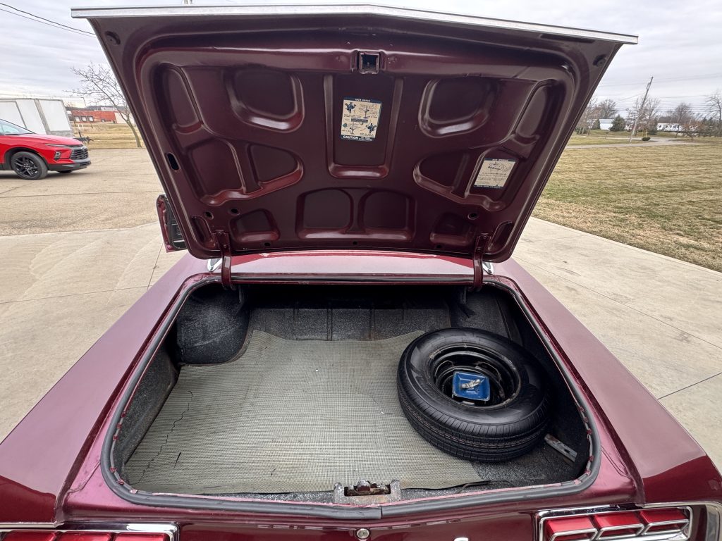 The trunk is nicely detailed over very clean metal. It is complete with a trunk mat, spare tire and jack assembly. It has new weather stripping and is finished in factory spatter paint.
