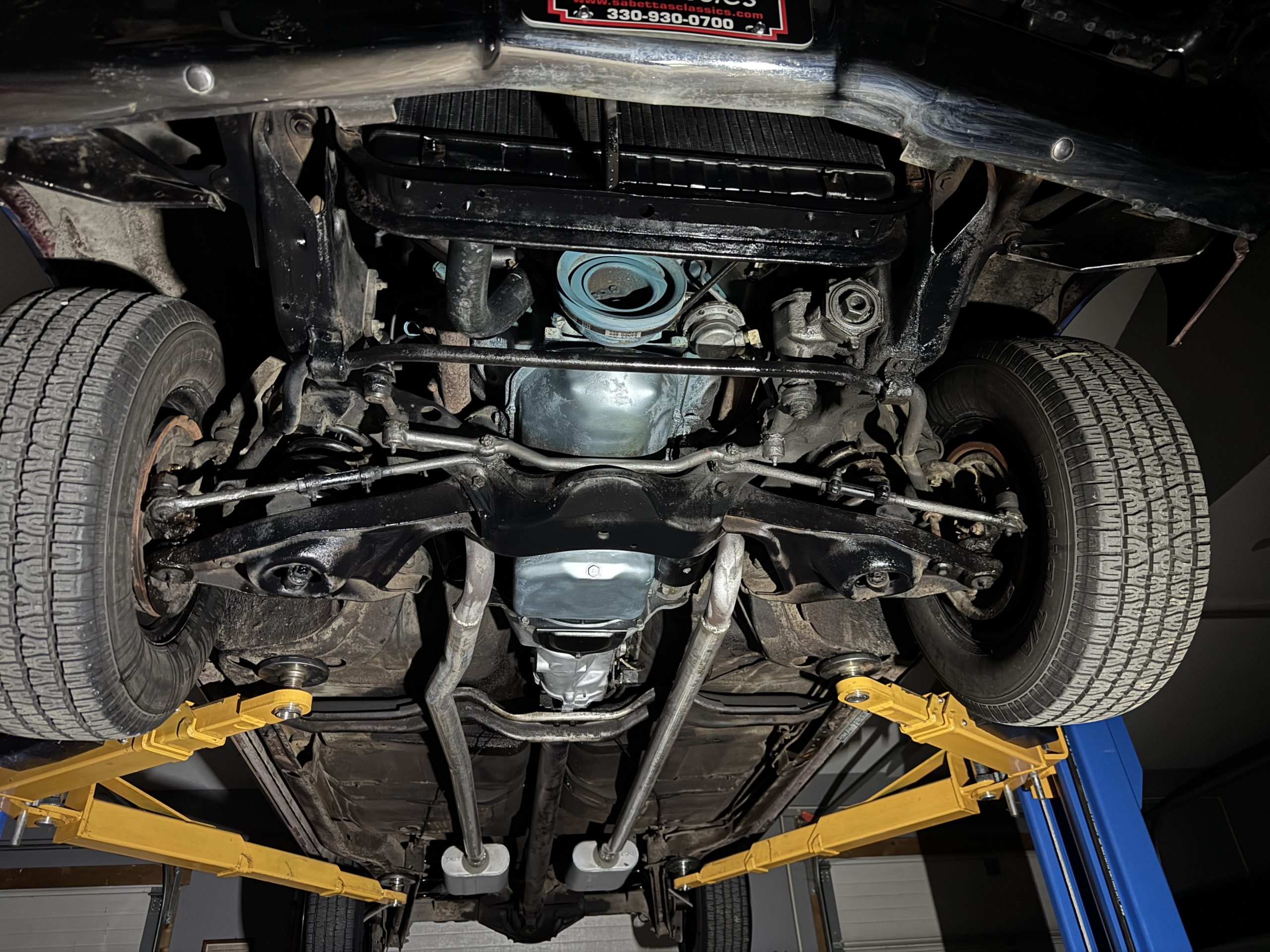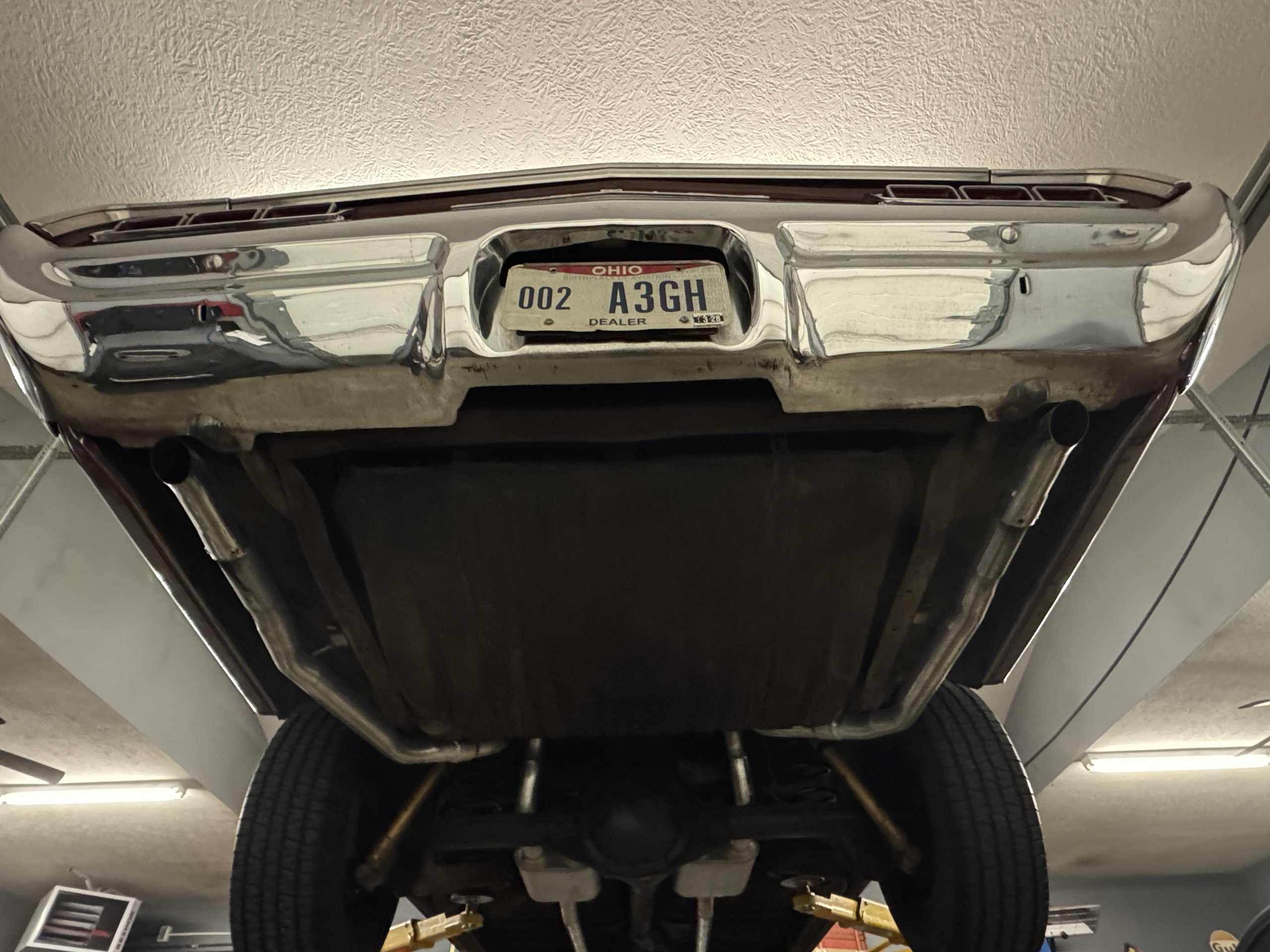 The undercarriage is all clean metal and original. The front end has been completely rebuilt. The bottom of the engine is clean. The Muncie 4-speed transmission is clean and the fuel and brake lines look good. The sending unit, gas tank and straps have been replaced. The dual exhaust looks good and runs out the rear of the car. All E-brake cables are hooked up and working.