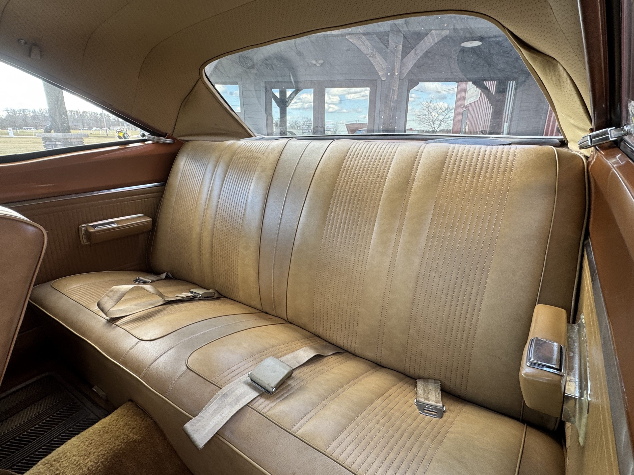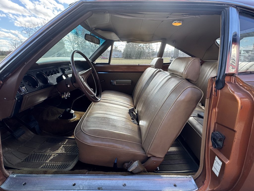 The interior is nice. Everything looks good and original. Looking at the instrument panel, everything is functioning properly. The heater controls slide with ease. It still retains its original steering wheel. The radio has been upgraded; we do have the original AM radio. The dash is very nice, nothing broken or cut. The door panels, headliner, visors and carpet all look to be original. The headliner has a few loose seams, a new one will come with the car. The weather stripping looks good.