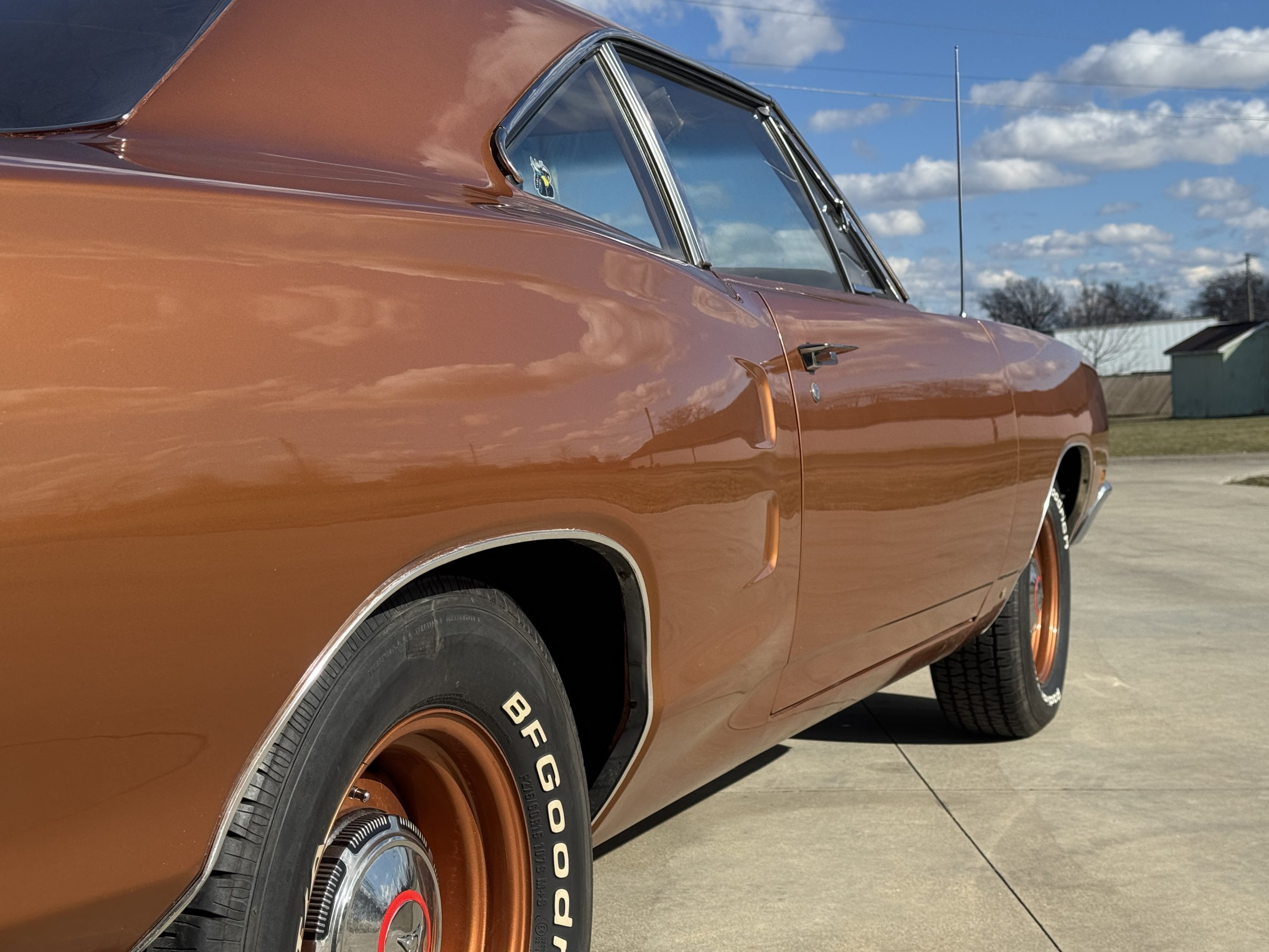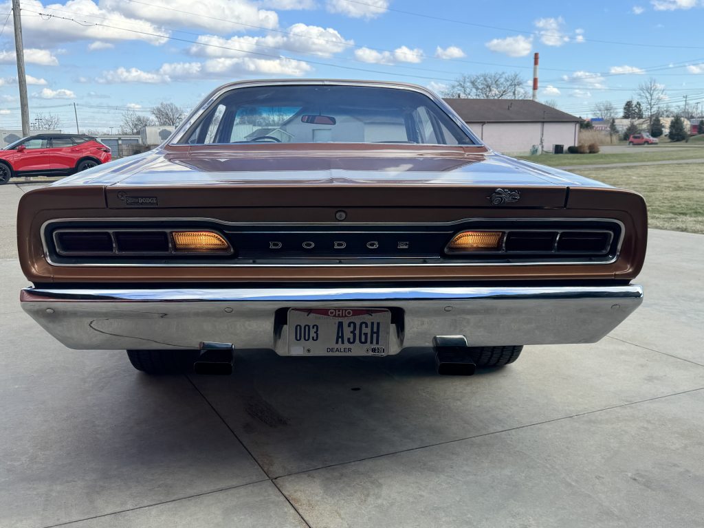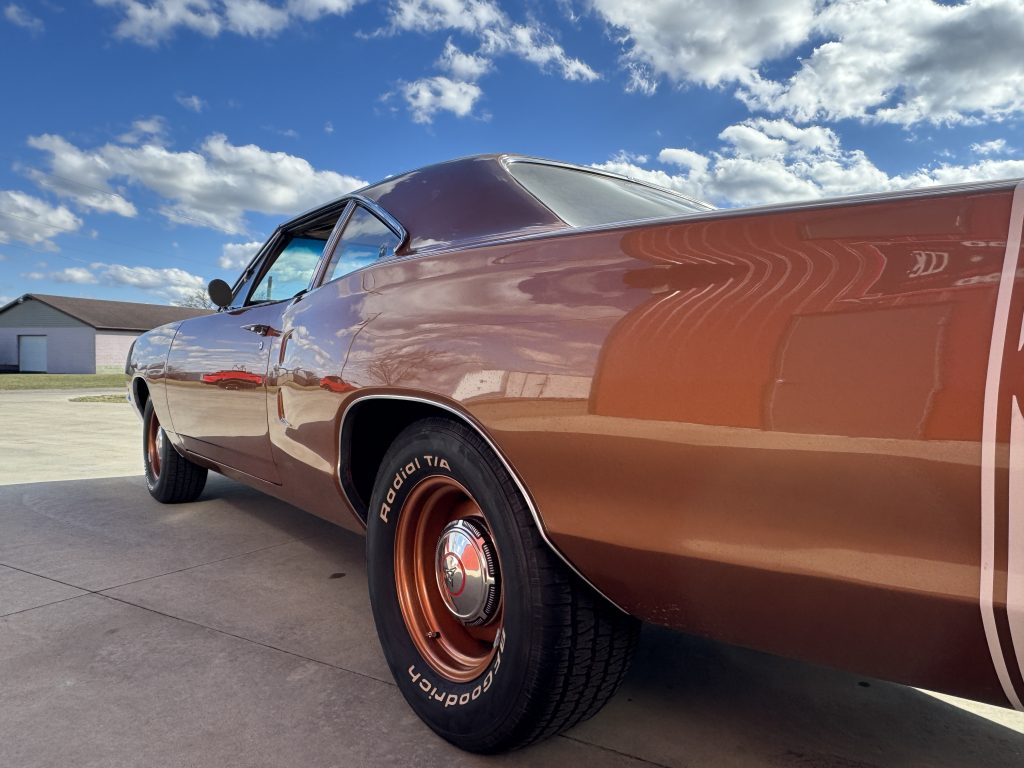 This is a genuine Dodge Super Bee featuring dry original metal. It looks great in its original color, Copper code T5. The paint is smooth and has a glossy finish. All the trim and chrome are in nice shape. It has the additional Super Bee white stripe on the back panel. It sits on a set of 15” steel wheels with newer BF Goodrich T/A radial tires.