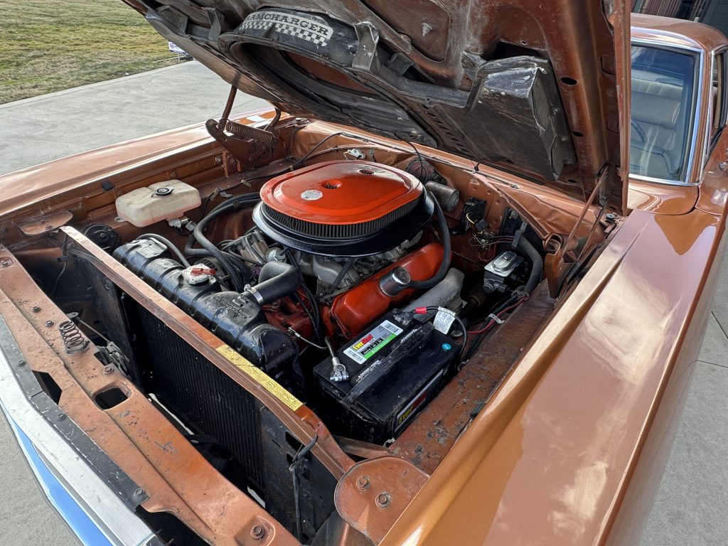 The engine bay is original and features a 383 ci motor, casting #2468130, date code 9/23/69. It has an upgraded dual feed Holley carburetor with aluminum intake manifold, stock exhaust manifolds, valve covers, Ram Charger air cleaner and original fender tag! It runs extremely strong!