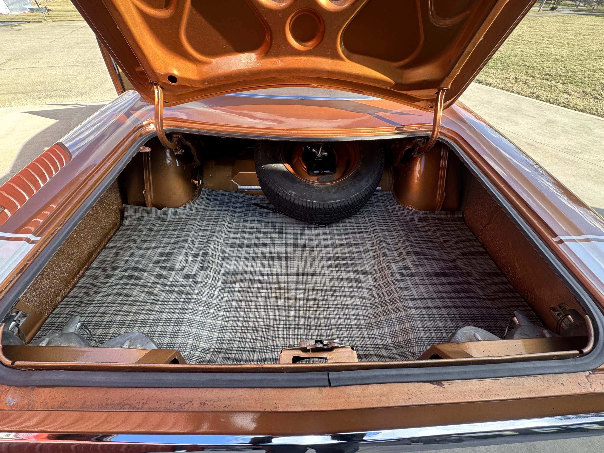 The trunk is all clean metal. It is entirely painted glossy Copper, the same as the exterior. It features a trunk mat, spare tire and jack assembly.