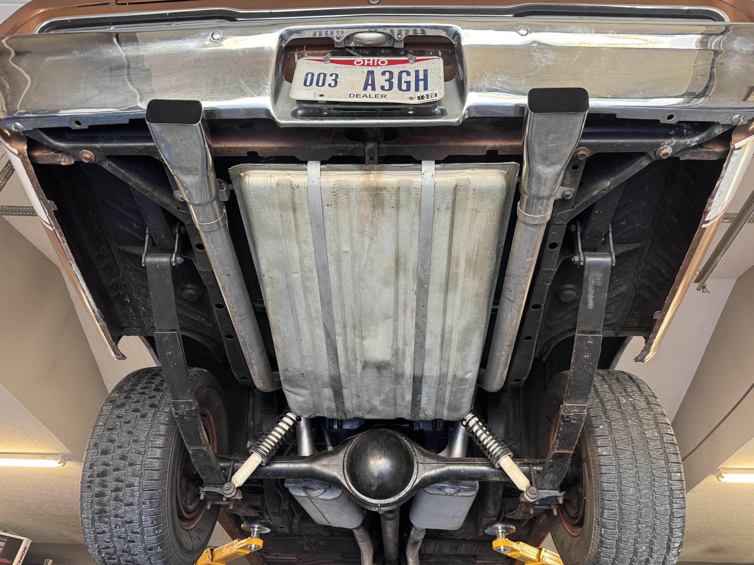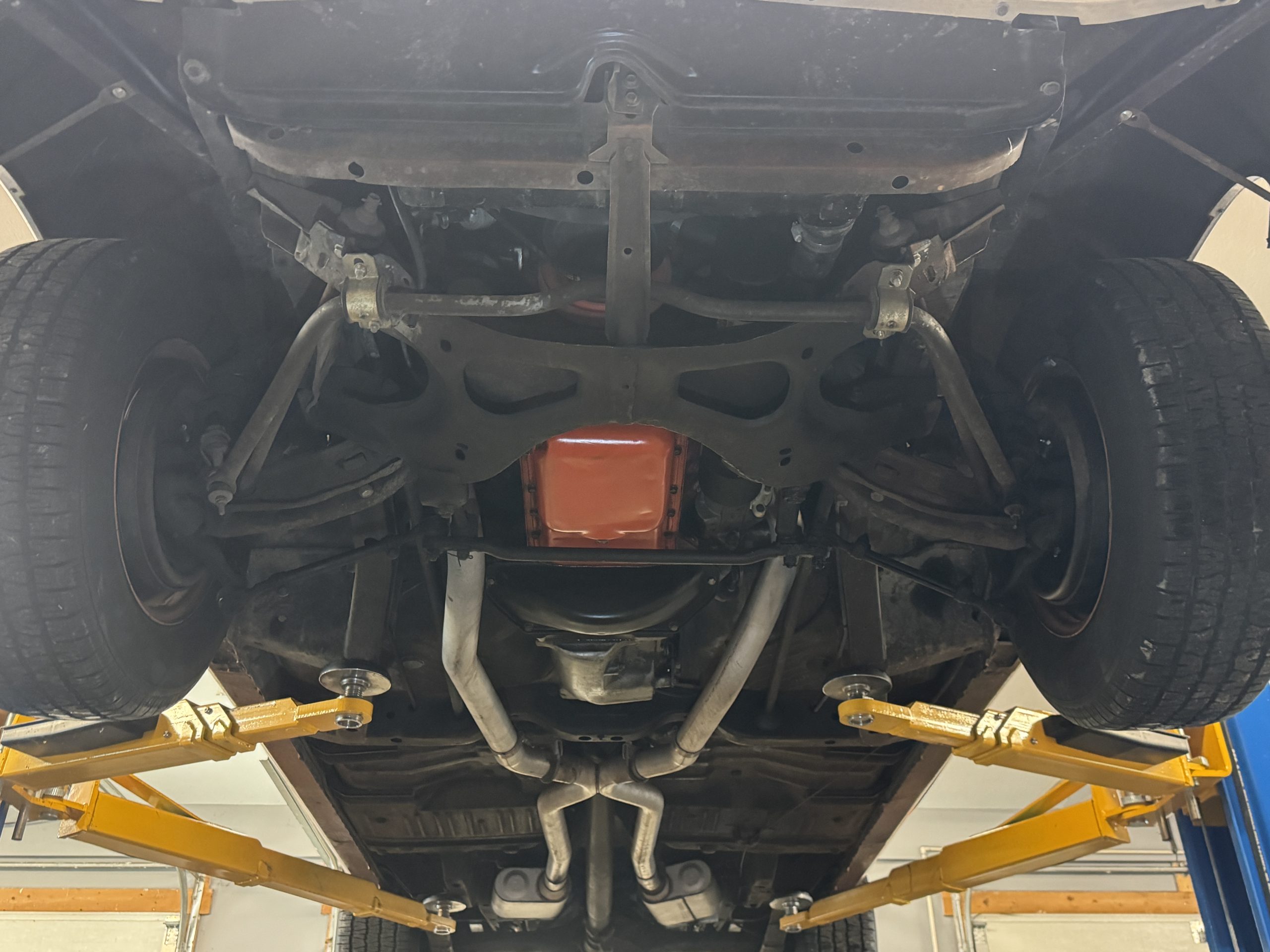 The underside is rock solid and appears to be all original. It features a dual exhaust that runs all the way out the rear with the correct exhaust tips. The bottom of the motor is clean as well as the original 833 4-speed manual transmission. The transmission shifts flawlessly and smoothly. There is a 8 ¾ Sure Grip rear end with 3:91 gears. The E-brake is complete and working.