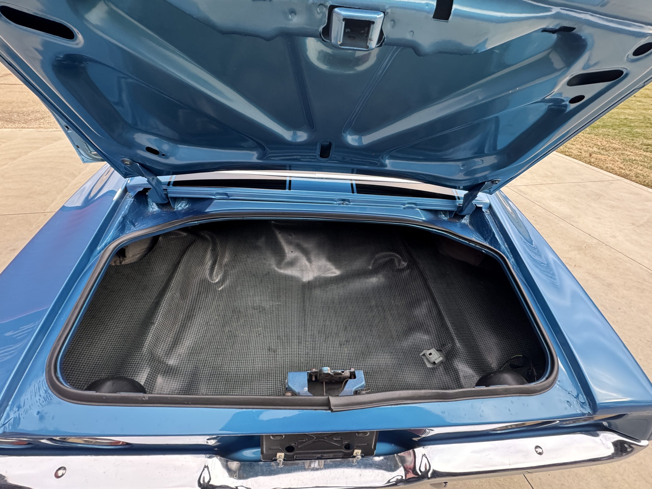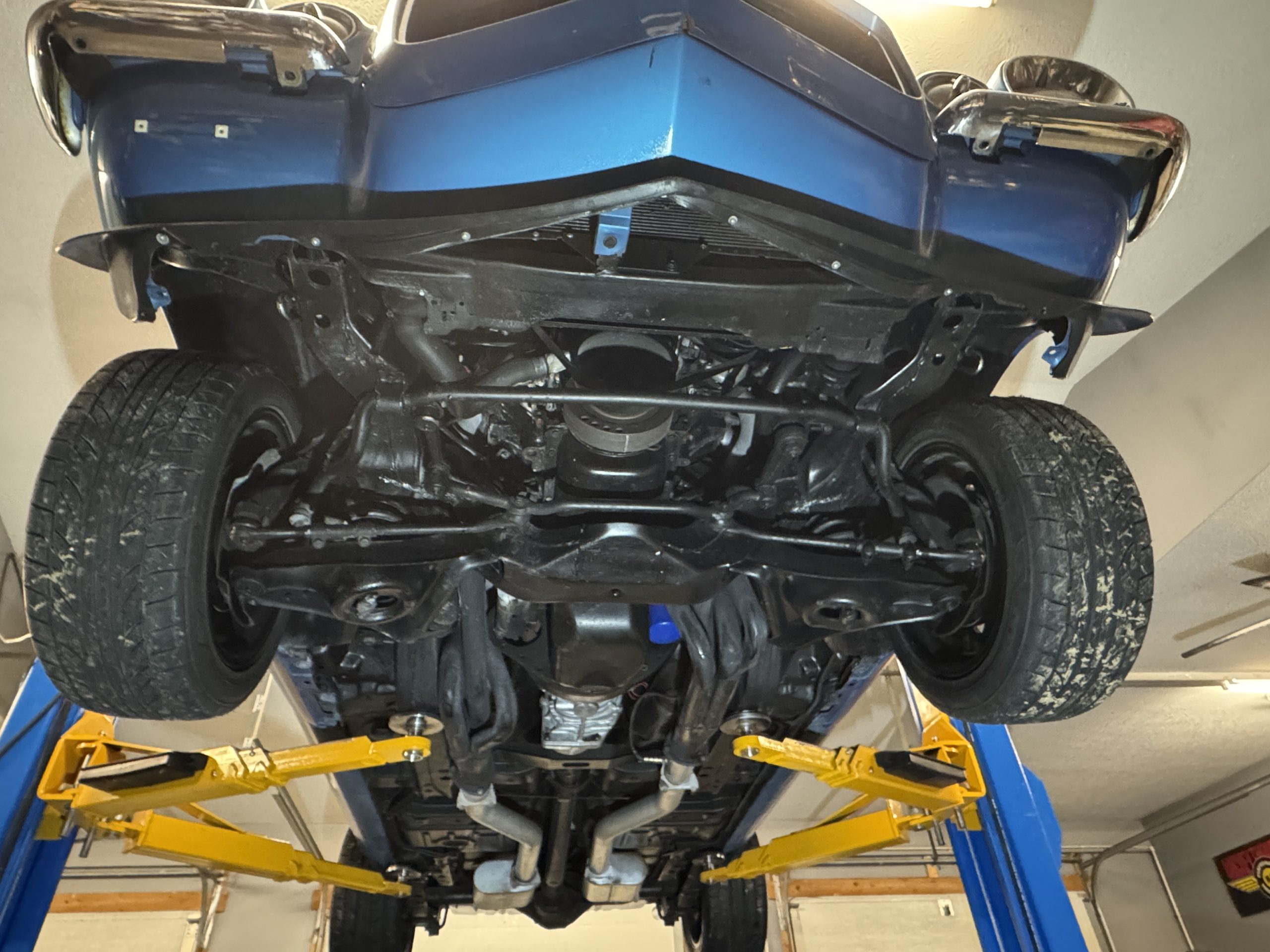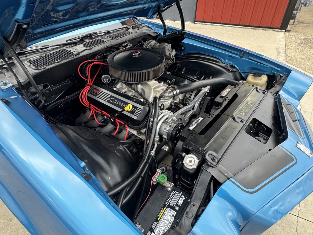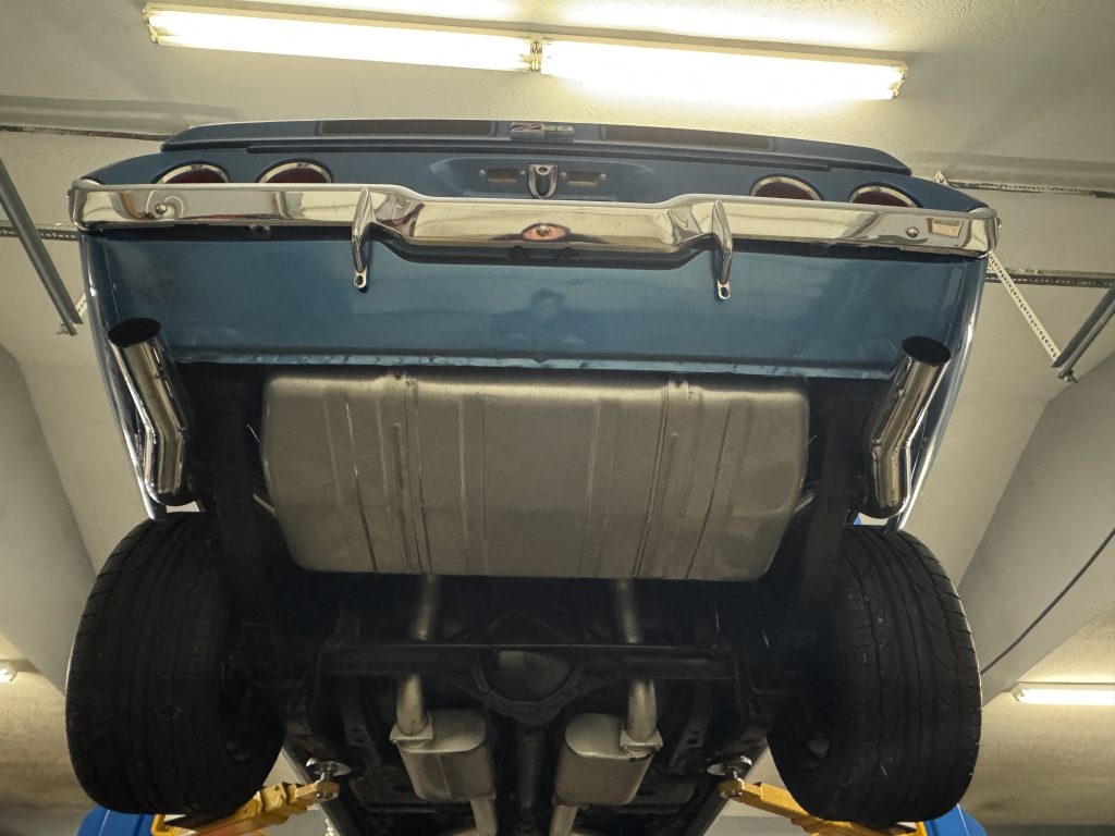 The undercarriage is all clean metal. All the steering components appear to have been replaced. The bottom of the motor and the Tremec 5 -speed transmission are clean. It has a 12-bolt 4:11 posi rear end, F41 suspension with a newer gas tank and straps. The exhaust system features long tube coated headers with 3” exhaust with Dynomax mufflers and polished stainless dual 3” tail pipes running out the rear of the car. The E-brake assembly is complete and working. The trunk is all clean metal and is complete with trunk mat,
