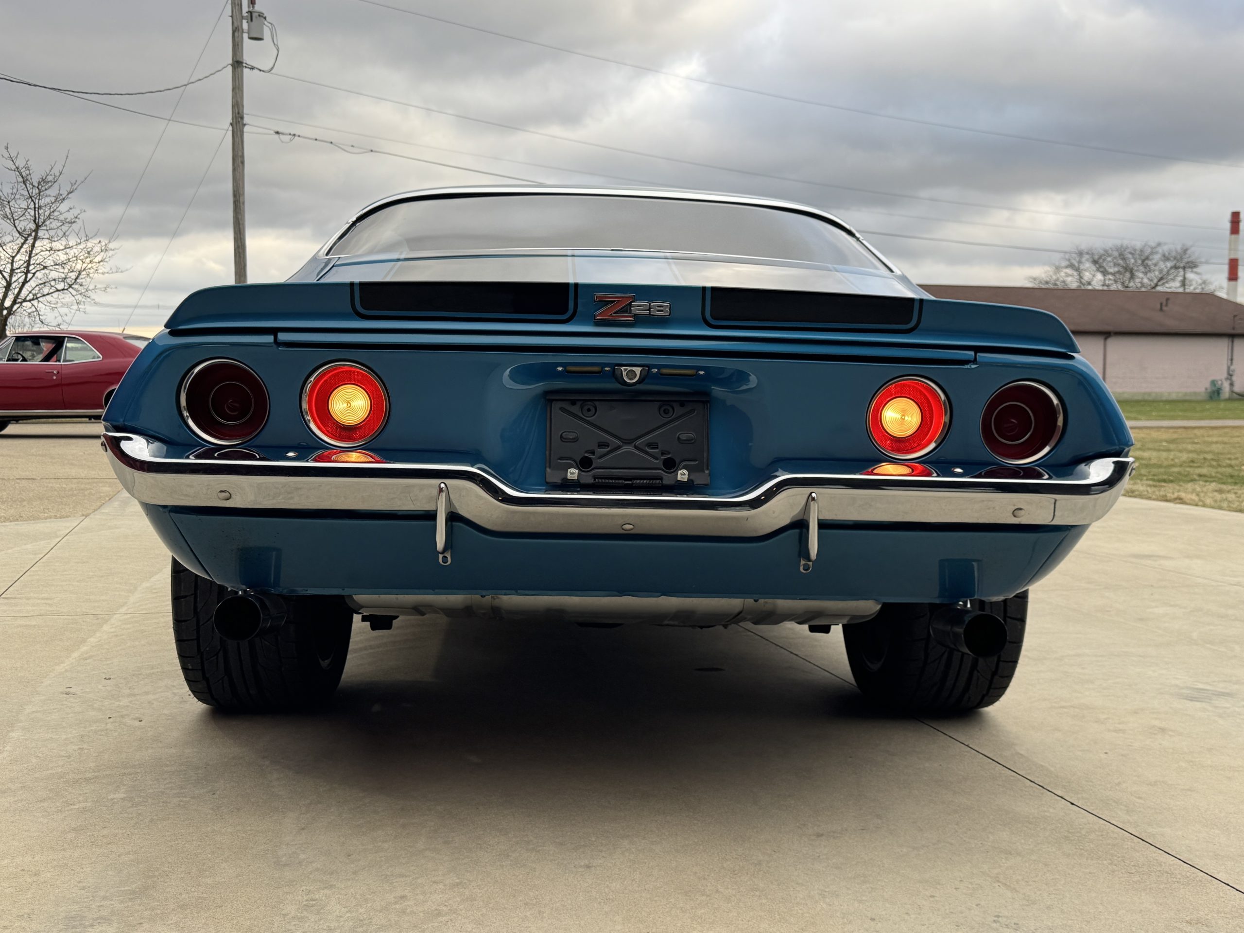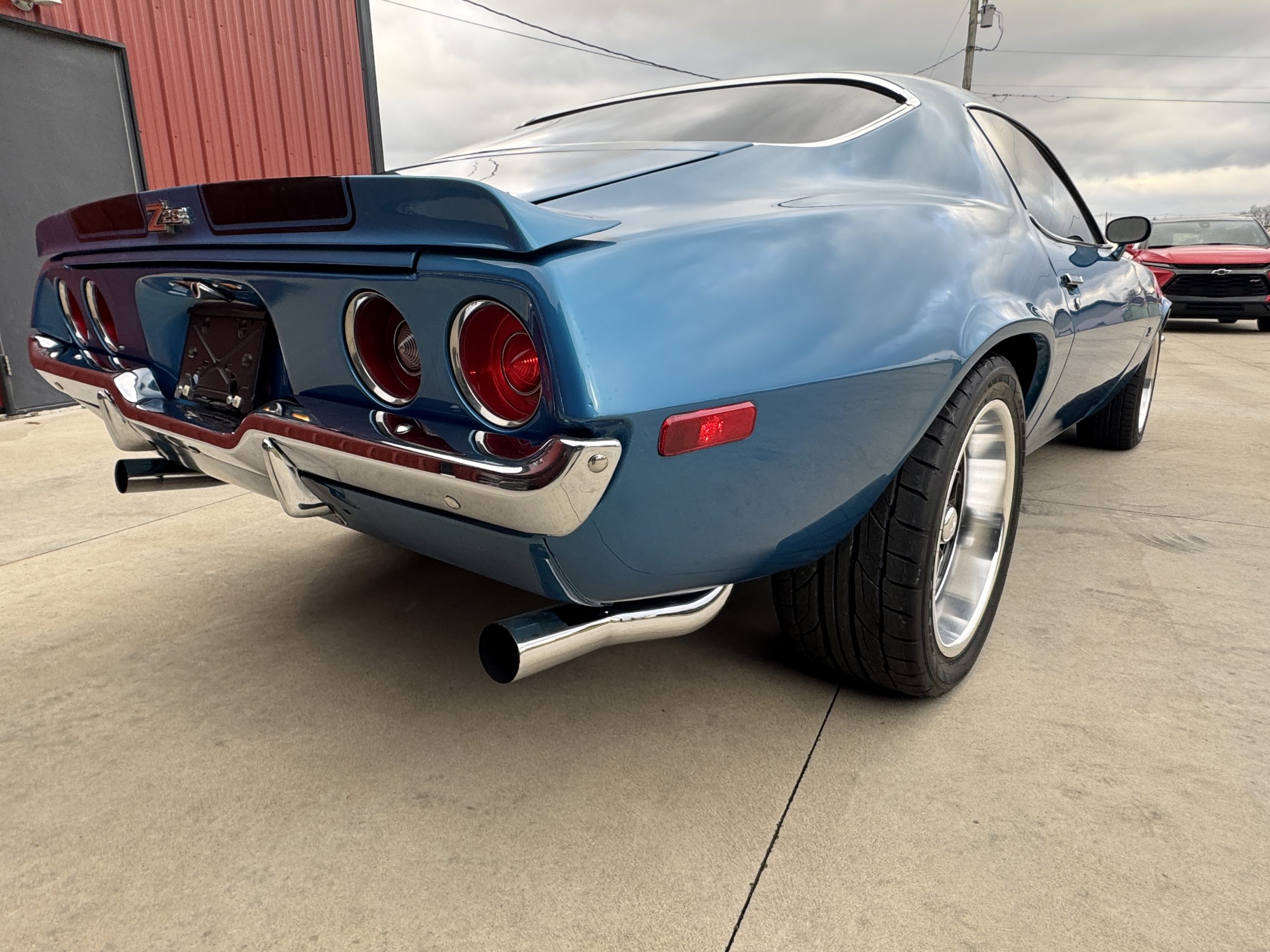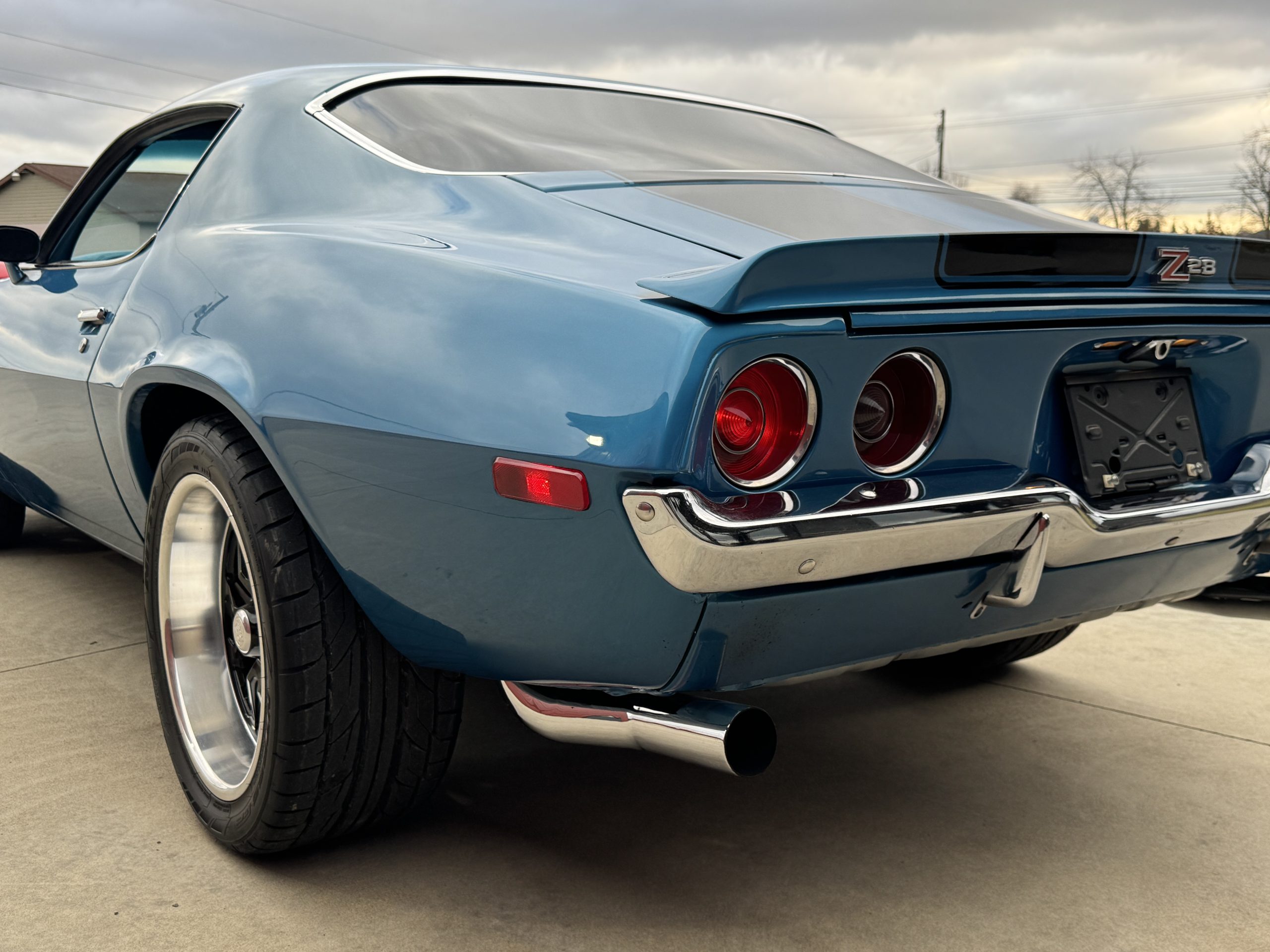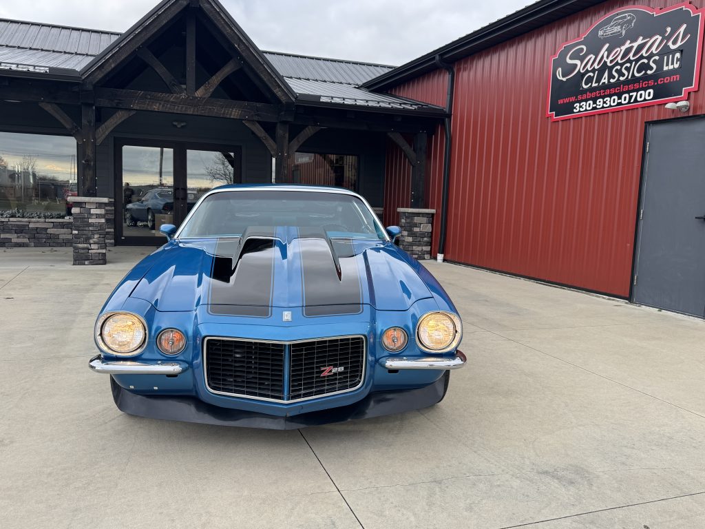 This is one nice Camaro, very clean with square and flush gaps, no rust or damage. It looks amazing in its original color, Mulsanne Blue code 26. It has a smooth and glossy finish. The glass is tinted and is very nice. The stainless and chrome look great too! It sits on a set of aluminum US Mags 17” in the front with 225/50 n555 Nitto tires and 18” on the rear with 285/40 nt 555 Nitto tires for that aggressive look.