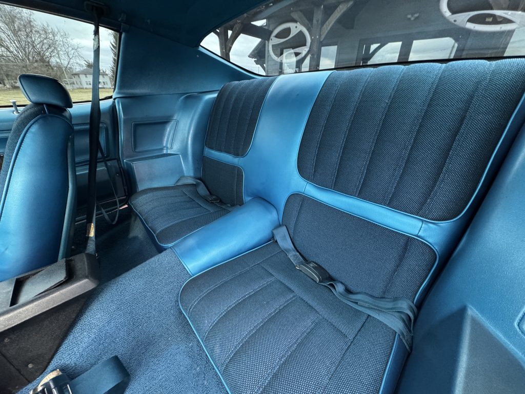 The interior is very nice. The seats have been re-cushioned and upholstered in blue vinyl and cloth. There is new carpet. The upper and lower door panels look good, the dash pad looks good as well. Looking at the dash, it is nice. All the factory gauges and tach work. It has its original RS steering wheel and an aftermarket AM/FM radio. The factory console is nice with its Hurst shifter sporting a white 5 speed shift knob. There are aftermarket oil and temp gauges mounted nicely in front of the console. The headliner is very nice. It also features front and rear seatbelts.