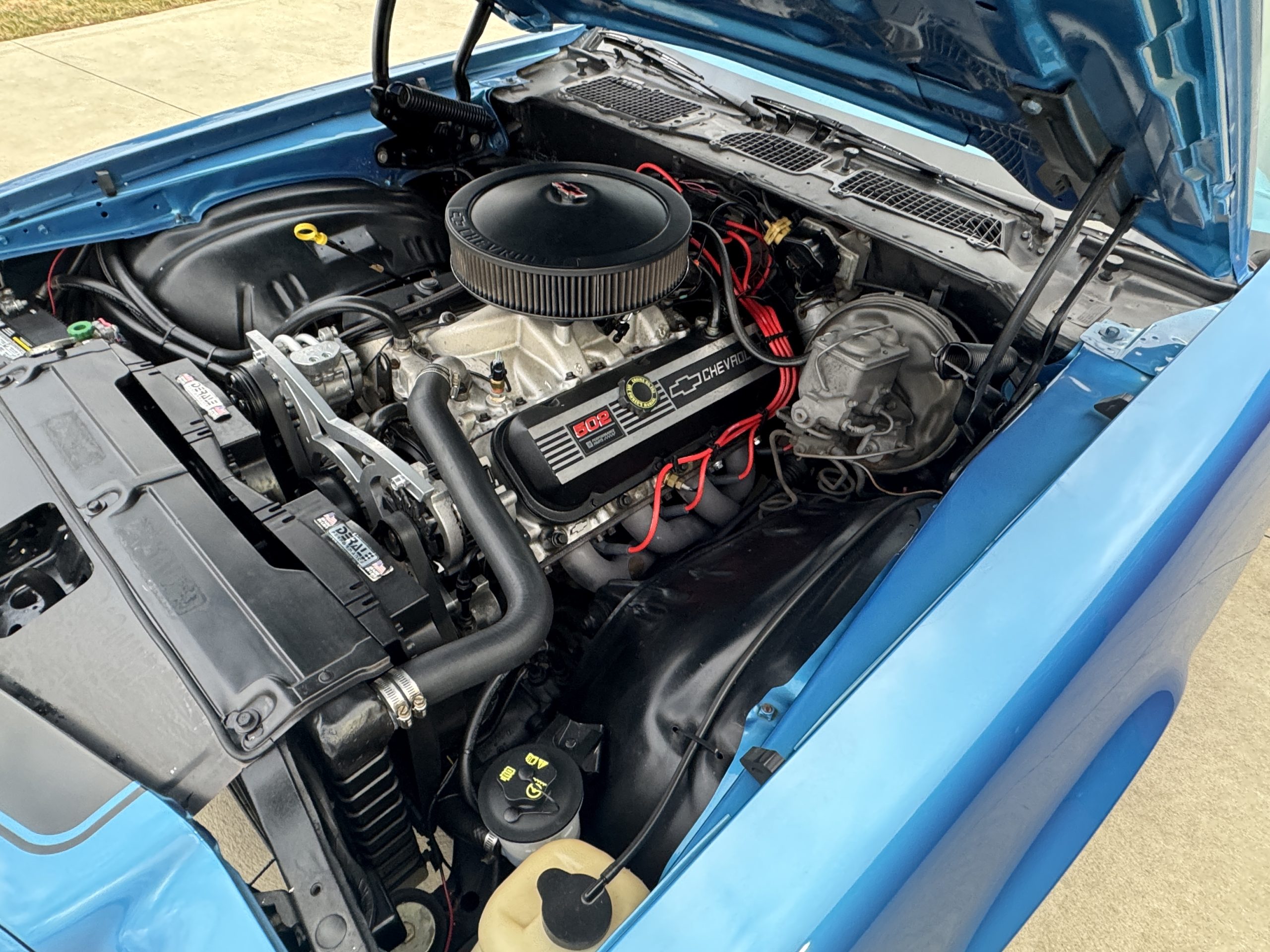 The engine bay is nicely detailed with its GM 502 crate engine. Some features include: March serpentine accessory drive system, Sniper fuel injection, Derale dual electric cooling fans, power brake booster, new dual master cylinder, black finned aluminum GM valve covers, black Chevrolet air cleaner lid, A/C, power steering and power front disc brakes.