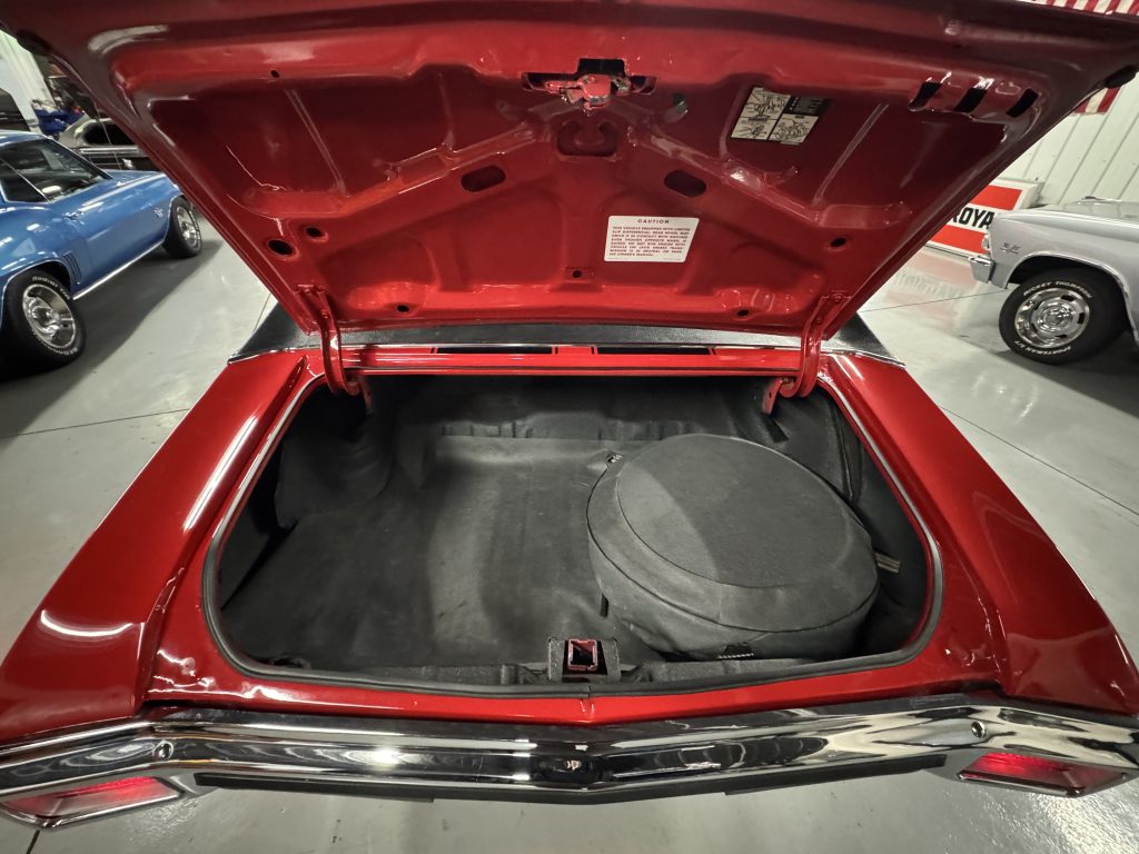 The trunk is all clean original metal. It has a light coat of trunk spatter paint, spare tire, trunk mat and new weather stripping.