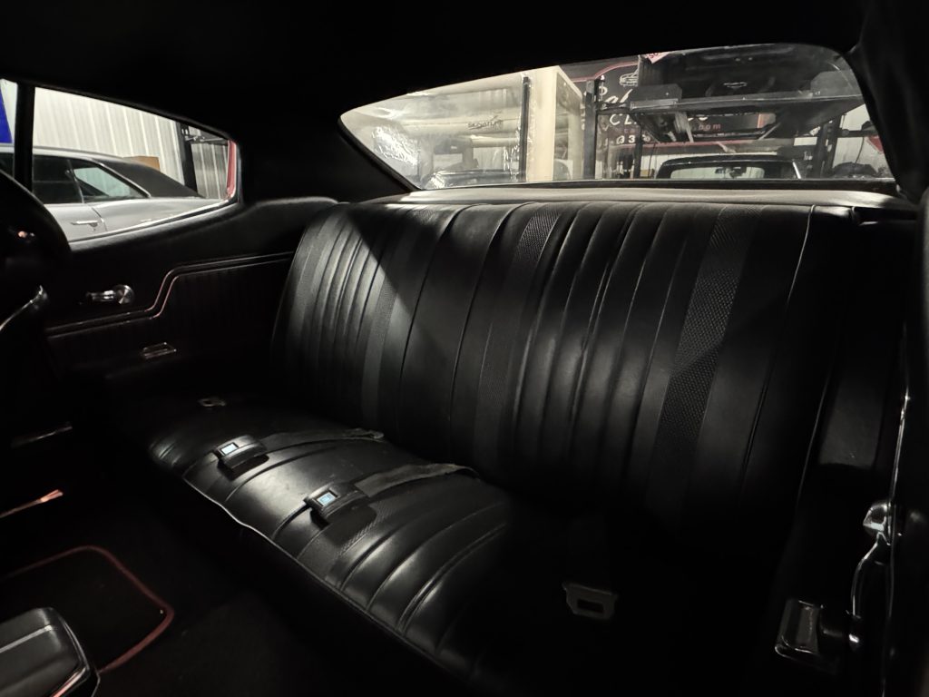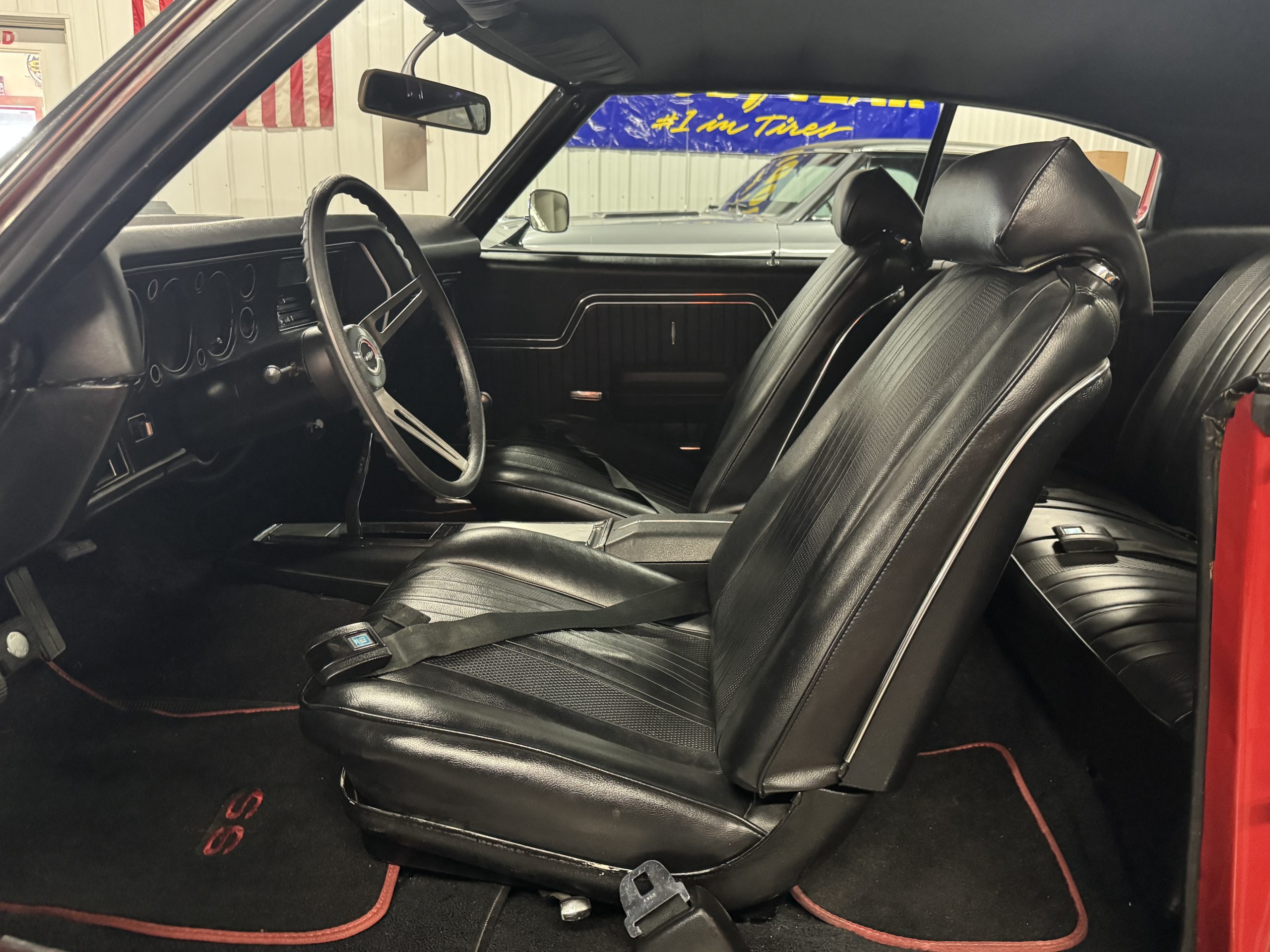 The interior is pretty much new from the carpet to the headliner, including new seat upholstery and cushions. It features black bucket seats, factory console with Hurst four speed shifter sticking out of it with correct chrome shift knob, AM radio, factory SS 3-spoke Sure Grip steering wheel, factory tach and gauges, front and rear GM seat belts.