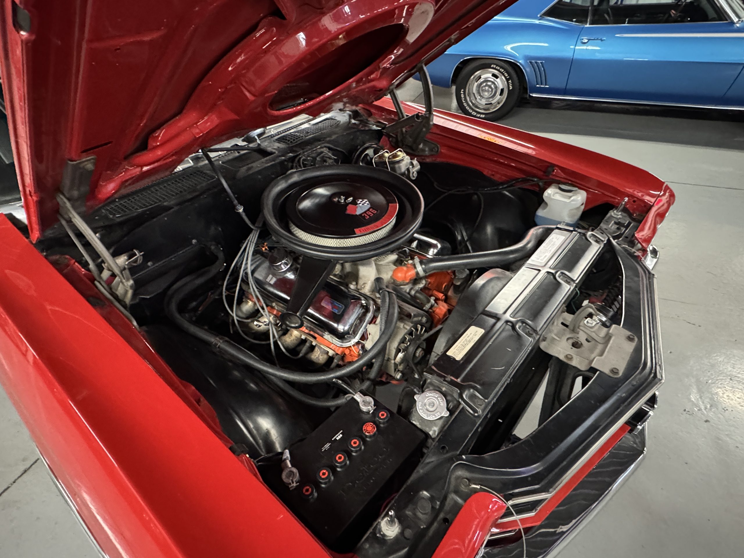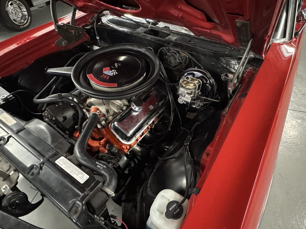 It is powered by its correct CTX 396 350HP motor with casting number 3968854.The VIN on the block matches the VIN on the car. It has a few performance upgrades: Performer RPM aluminum intake manifold, Holley Snipper Fuel Injection set up, HEI ignition, factory chrome valve covers, Cowl Induction air cleaner, power steering and  4-core radiator with factory fan shroud. It has a set of long tube headers, GM hoses with the correct tower clamps, factory spring type battery cables. The engine bay has a satin black finish.
