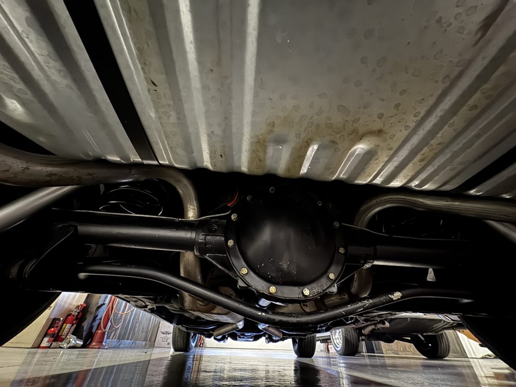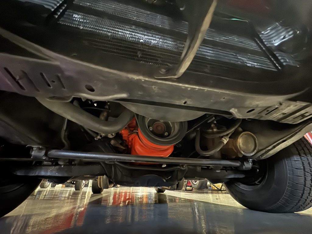 The undercarriage is all clean metal and painted in a black satin. The bottom of the motor is clean as well as the Muncie 4 speed manual transmission. It has power front disc brakes. It has a 2.5” dual exhaust system with Flow Master mufflers and stock tailpipes running out the back with correct cowbell tips. It has a 12 bolt rear end with 3:31 gears and F41 suspension, new gas tank, straps and fuel sending unit. The E-brake assembly is all hooked up and working.
