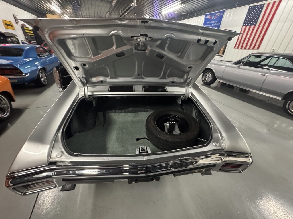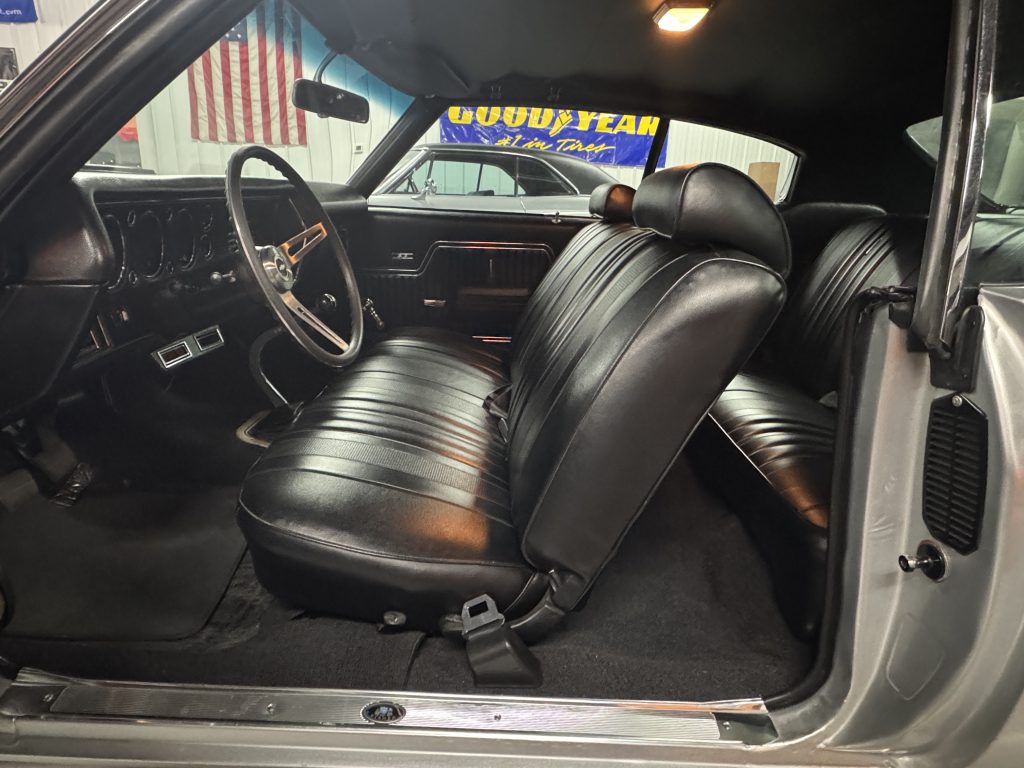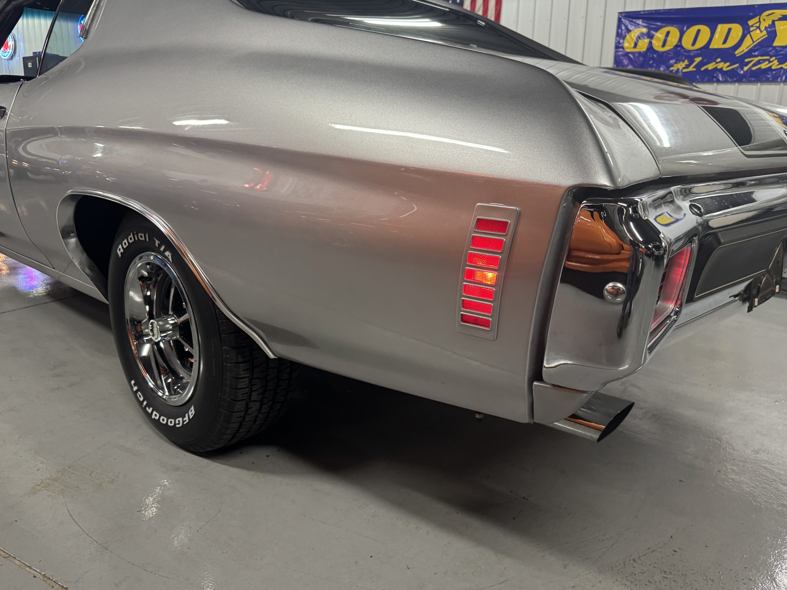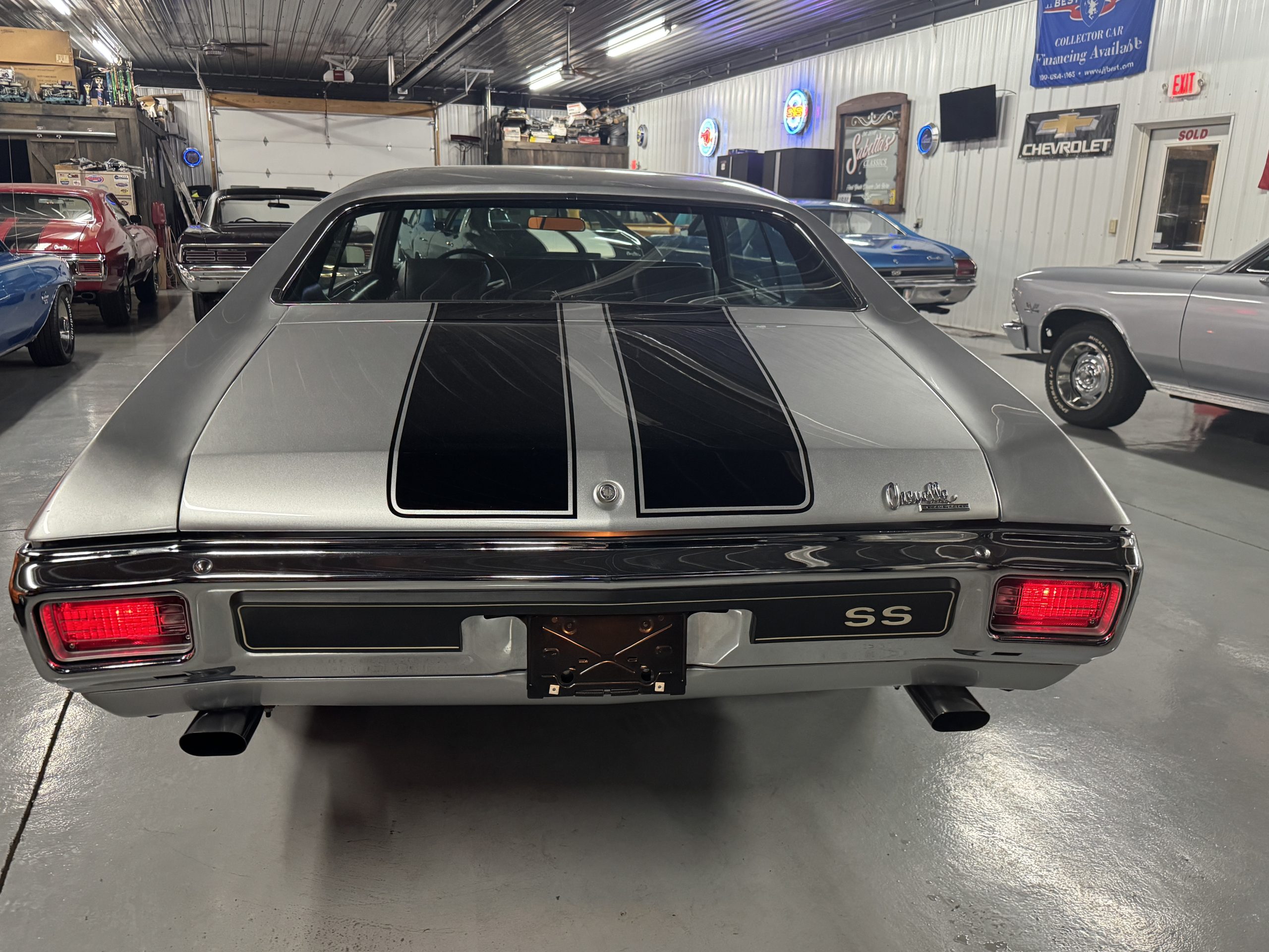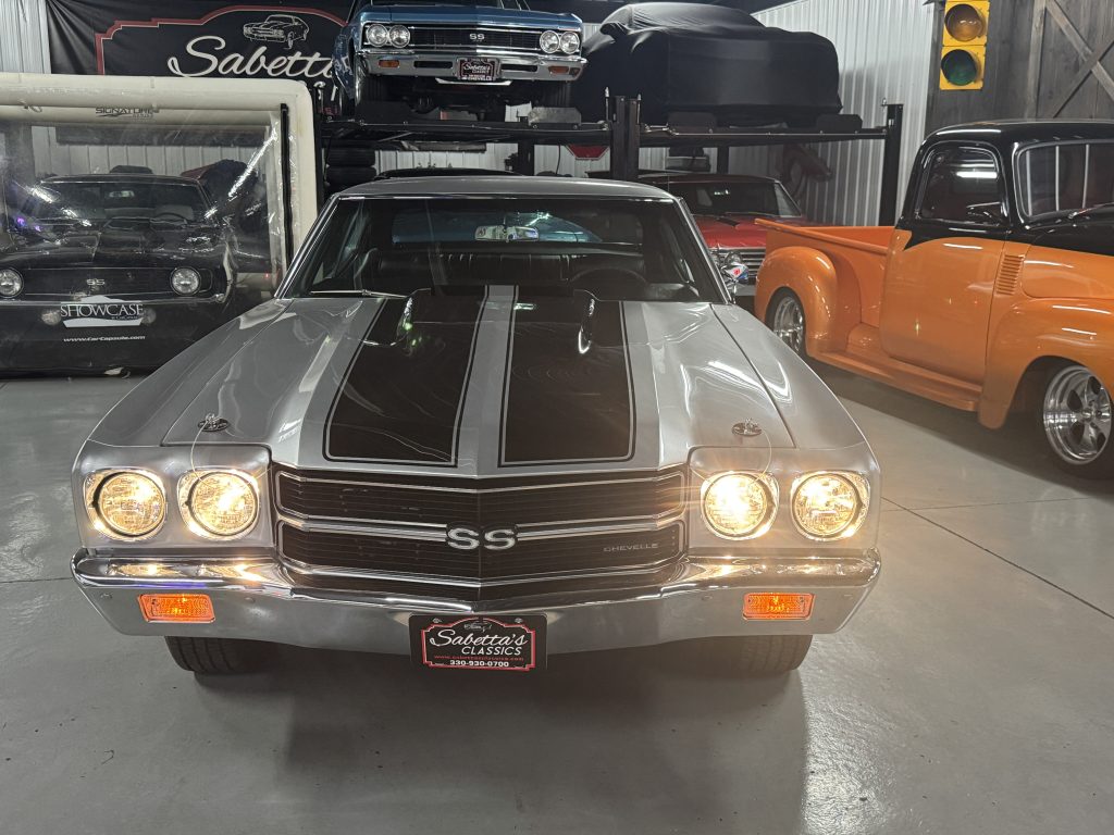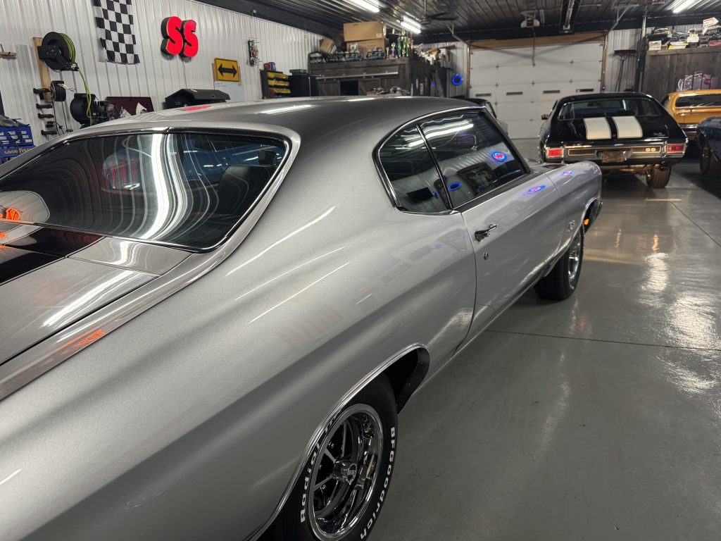 This is one of the most sought after muscle cars! This 1970 Chevelle is wearing an original color, Cortez Silver with black stripes running down the Cowl Induction hood and trunk! The body is clean and straight. All lines and gaps fit nicely. It appears to have all factory sheet metal. The doors close like they were new. The paint has a nice smooth and glossy finish. The front grill, emblem, headlight bezels and front bumper look great. The stainless trim is polished and straight. The rear bumper, SS pad and tail light lenses are very nice. The glass is tinted and in good condition. The door jambs are painted and glossy. All the  weather stripping is like new. It sits on a set of 14x7 factory style SS wheels with a new set of 225/70/14 BFG T/A radial tires.