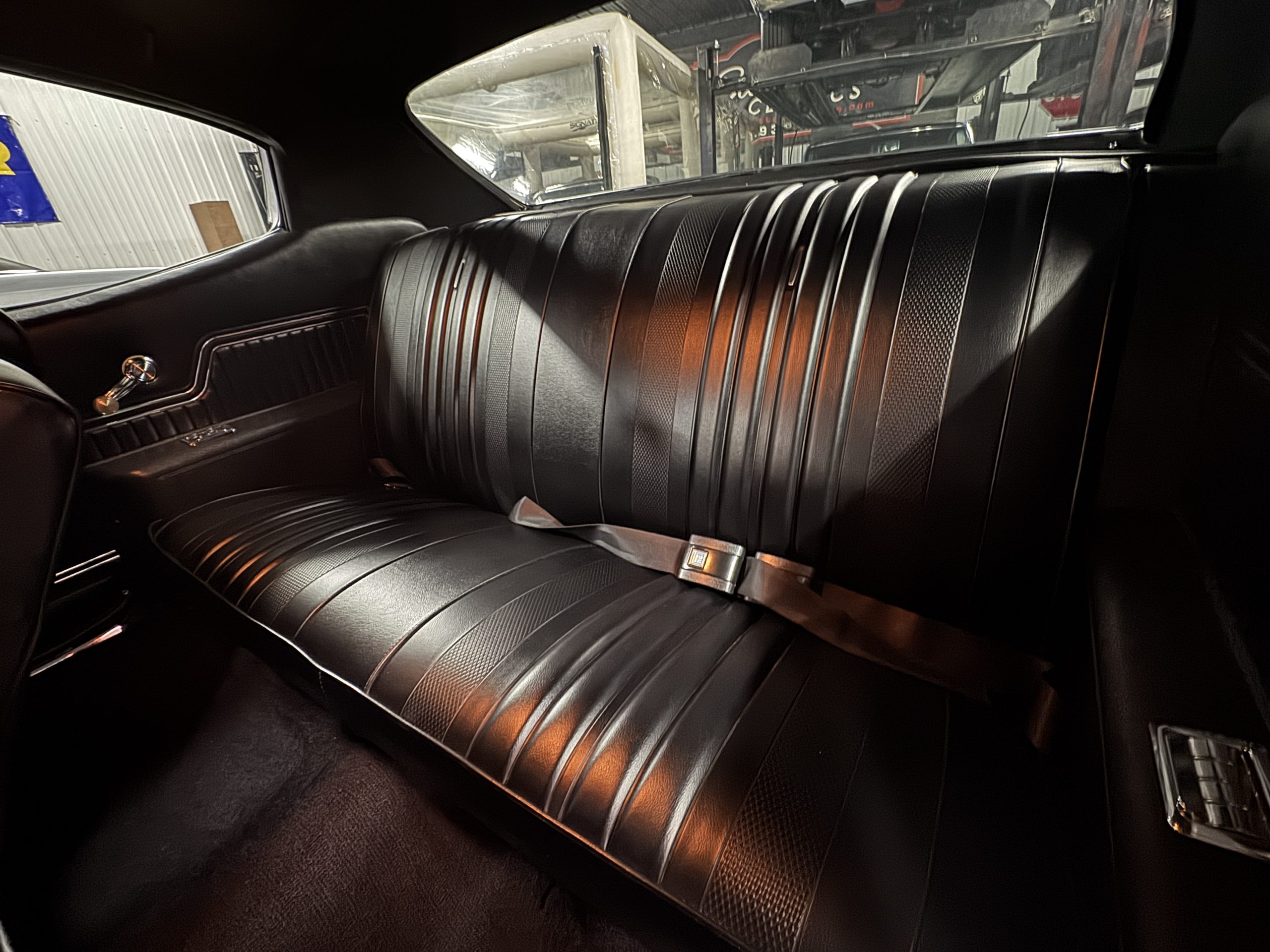 The black interior really pops up against the Silver exterior and it is in excellent shape! It sports a factory bench seat with the correct Muncie 4 speed shifter and correct two piece black shift knob sticking out of the floor sporting the correct bezel and boot. It features the optional tach and gauges, clock, factory  3 spoke Comfort Grip steering wheel and a tilt steering column. The Vintage A/C and heater controls all operate smoothly. It has a retro style factory AM/FM radio. The dash pad is in good shape. The carpet, sill plates and door panels are all in nice shape as well. It also features GM front and rear seat belts.