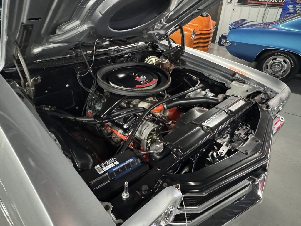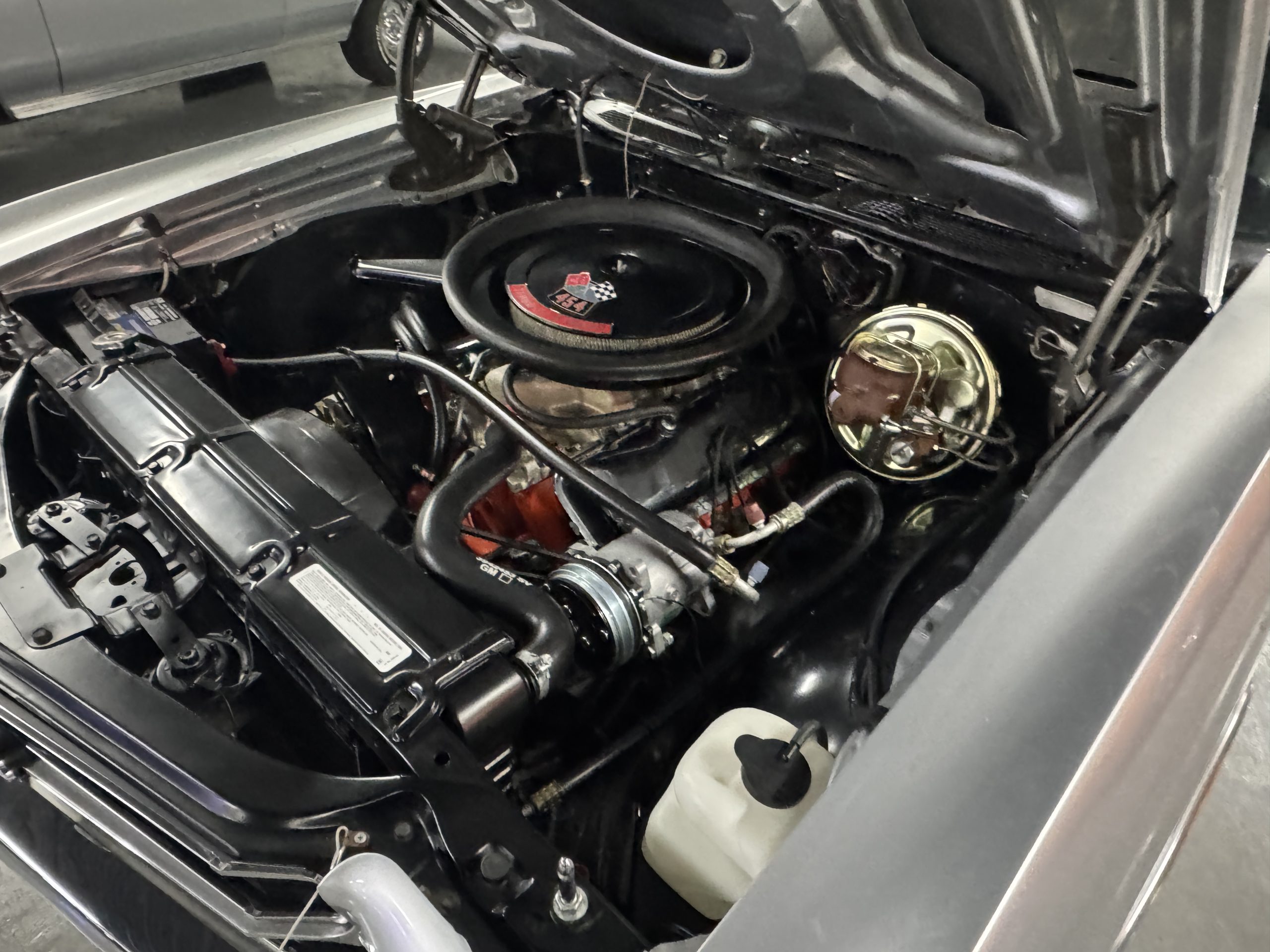 The engine compartment is clean and complete! It has a GM crate 454 ci engine that runs very strong! It features an Edelbrock 4 barrel aluminum intake manifold with dual feed Holley carburetor and correct fuel line. It also has factory exhaust manifolds and factory chrome valve covers, Cowl Induction cleaner, 4 core radiator, correct fan shroud and fan and Vintage A/C that blows cold. It also features GM hoses with correct tower clamps. Everything is nice and correct.