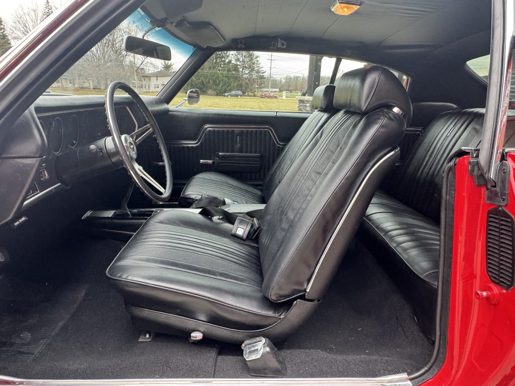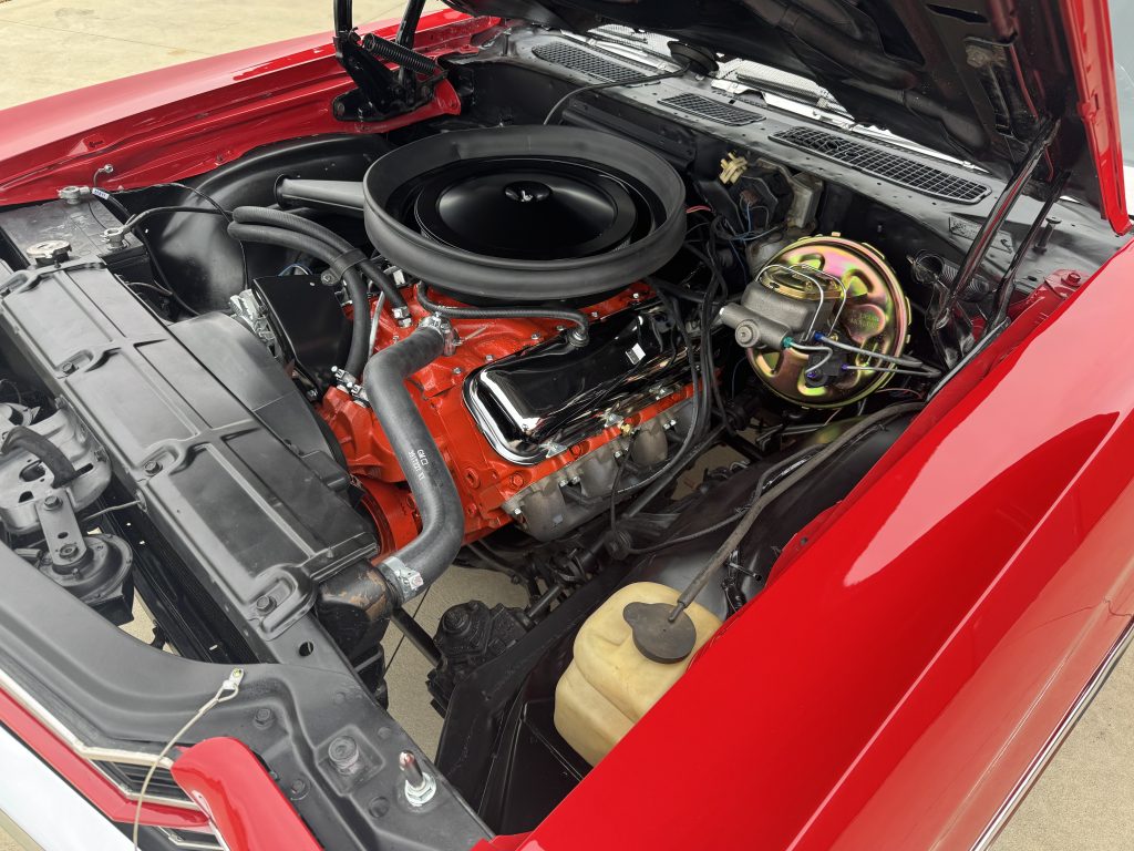 The engine compartment is nicely detailed and correct. It has a period-correct 454 ci engine, with a few performance upgrades. Upgrades include a dual feed Holley carburetor with correct fuel line, HEI ignition for reliability, correct Cowl Induction air cleaner and factory chrome valve covers. It also features a cadmium plated Delco Moraine brake booster, correct master cylinder, correct hoses and tower clamps, spring type battery cables, 4-core radiator with the correct fan shroud and clutch fan. The engine bay is finished in a satin black.