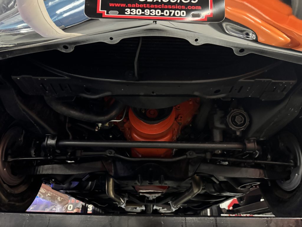 Looking up at the motor, it is clean as well as the Muncie M21close ratio- 4 speed transmission. The floors are all clean metal, no signs of rust or patches. It has front disc brakes and the frame was powder coated during the frame off restoration. There is a 12 bolt rear end with 3:31 gears. It also features an F41 suspension which consists of rear boxed in control arms and rear sway bar. It has a newer gas tank, fuel lines, brake lines and a new dual exhaust system that runs all the way out the back with the correct cowbell exhaust tips. The E-brake assembly is complete, hooked up and working.