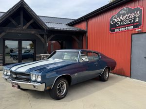 1970 Chevrolet Chevelle SS 454 – SOLD! COWL INDUCTION, GAUGES This is one sharp car in a factory color, Fathom Blue code 28! There are gloss white SS stripes running down the Cowl Induction hood and trunk lid. Looking down the sides of both sides it is straight. It has a functional cowl induction hood…